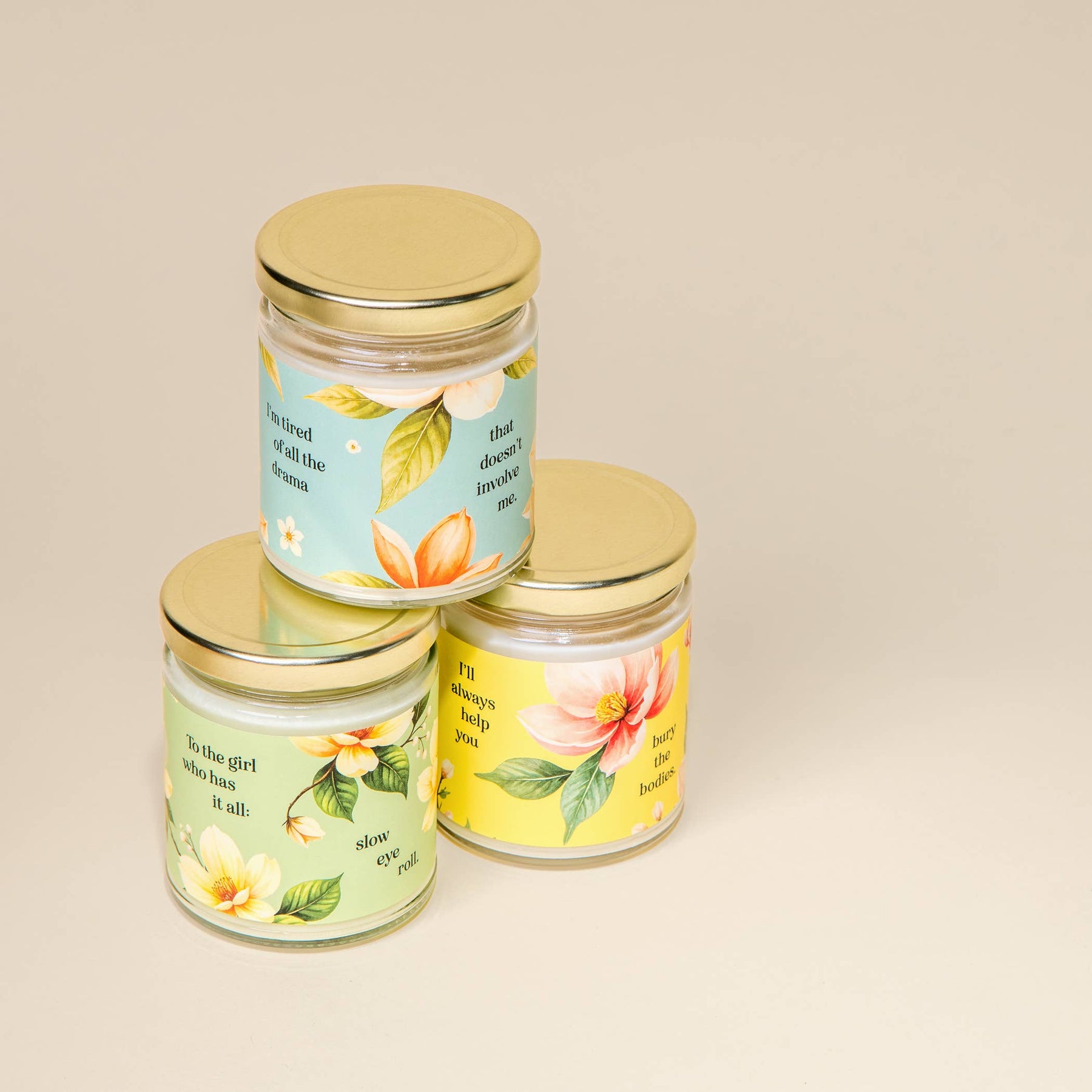We know—florals in fall. Groundbreaking. But honestly? We’re tired of pumpkins bossing the whole season around. Sure, it’s October. But we love breaking rules even more than we love pretty shit. For when life isn’t perfect, but at least it smells like it. This collection of floral candles pairs pretty wallpaper labels with dead-on truths—because sometimes you want petals, and sometimes you want punchlines. Light one up when you’re manifesting naps, eye-rolling at overachievers, hiding evidence, or just sweating through life’s “romantic era.” It’s flowers… without the allergies. Bouquet Noir Scented Fragrance: Magnolia, Sandalwood Net Weight: 6.5 oz. Hand-poured 100% soy wax candle Burn time: Approx. 40 hours Note: Because all of our candles are handmade, no two are identical. © 2025 Whiskey River Soap Co. Jar size: 2 ¾" D x 3 ½" H Sold in 4-packs