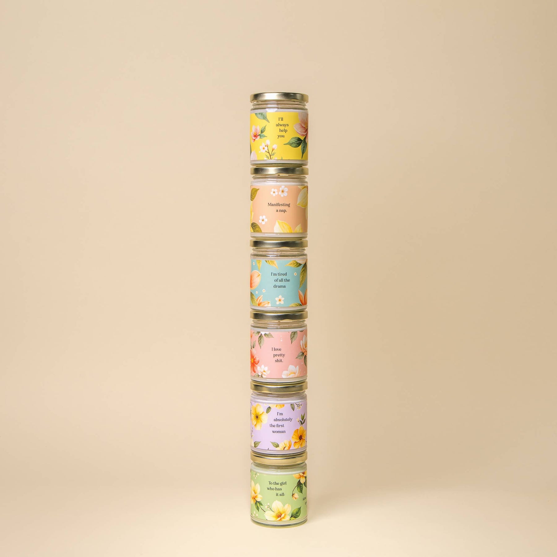 We know—florals in fall. Groundbreaking. But honestly? We’re tired of pumpkins bossing the whole season around. Sure, it’s October. But we love breaking rules even more than we love pretty shit. For when life isn’t perfect, but at least it smells like it. This collection of floral candles pairs pretty wallpaper labels with dead-on truths—because sometimes you want petals, and sometimes you want punchlines. Light one up when you’re manifesting naps, eye-rolling at overachievers, hiding evidence, or just sweating through life’s “romantic era.” It’s flowers… without the allergies. Flower Fetish Scented Fragrance: Plumeria, Teakwood Net Weight: 6.5 oz. Hand-poured 100% soy wax candle Burn time: Approx. 40 hours Note: Because all of our candles are handmade, no two are identical. © 2025 Whiskey River Soap Co. Jar size: 2 ¾" D x 3 ½" H Sold in 4-packs