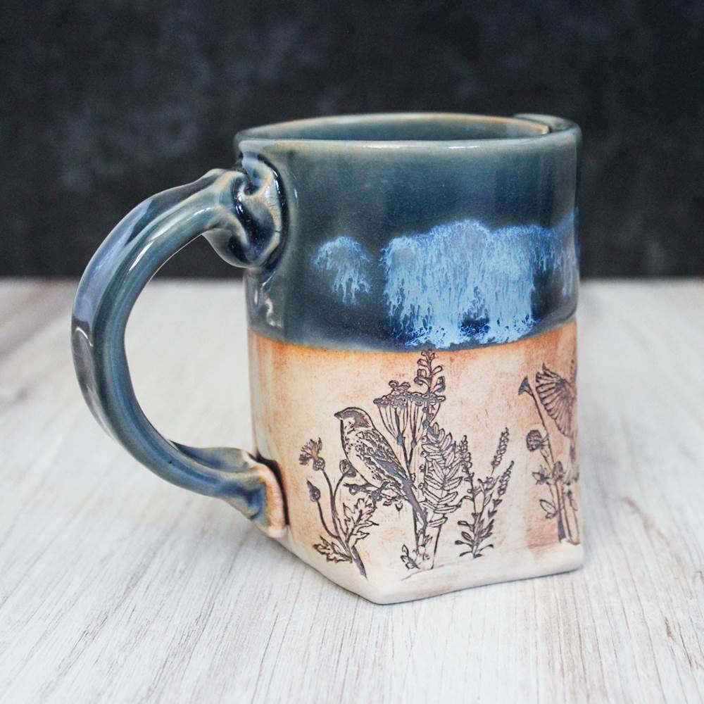 Unlike most of the ceramic mugs you see, this piece is handmade from a flat slab of clay that is then folded into its unique shape. They are super durable after 14 hands on steps that take a total of 9 days to make each one from start to finish. This mug is not just a functional piece but also a piece of art being pressed with hand drawn stamps, real dried wild flowers and real antique lace.