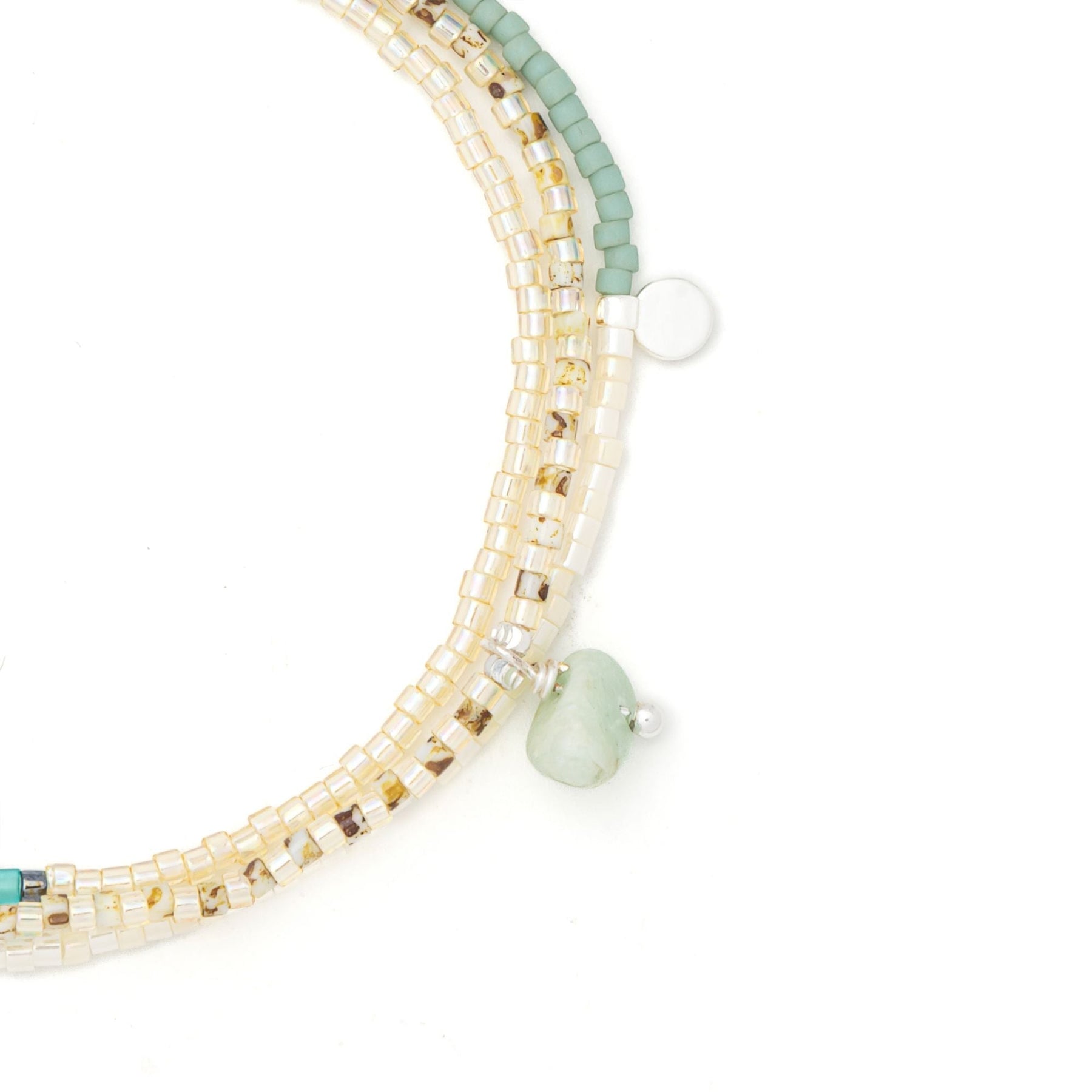 Hand strung with Japanese Miyuki Beads, organic pearls, and meaningful stones, each bracelet/necklace wrap comes packaged on a nostalgia-inspired postcard that celebrates life's journey & heartfelt connections.