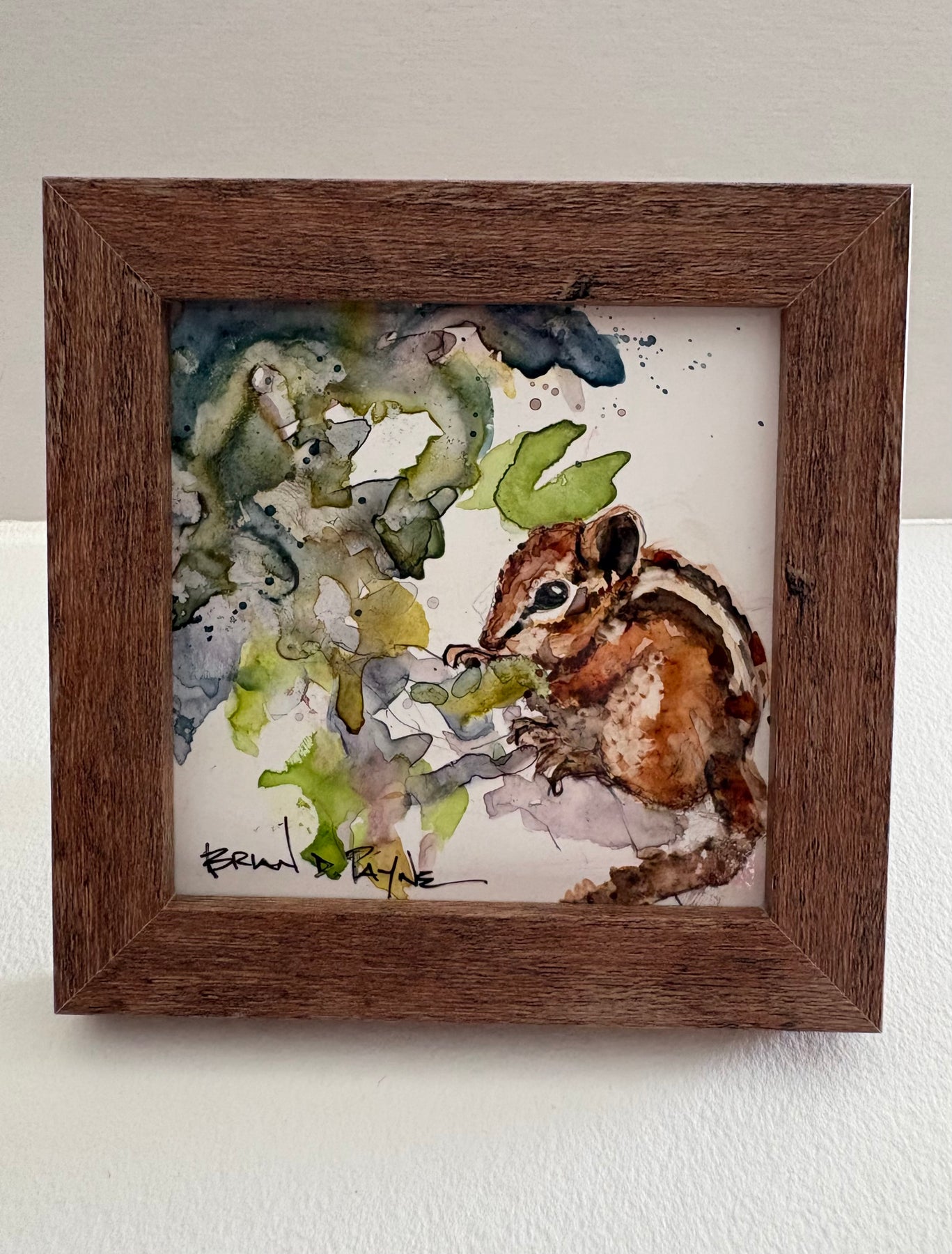 This Watercolor painting is framed with a kickstand style frame that can free-stand or be hung on the wall.