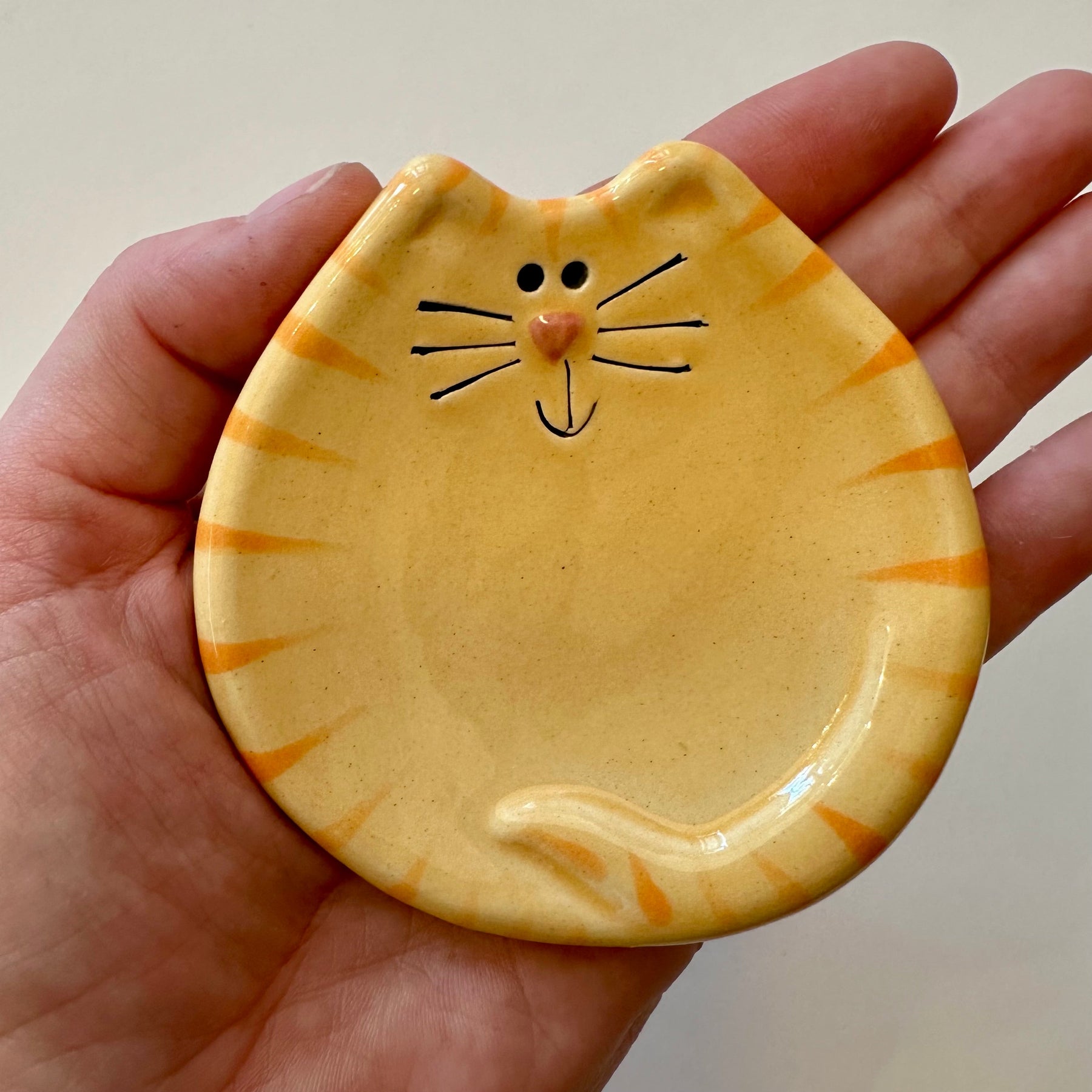 This handmade dish is painted with ceramic glazes. It is commonly used as a ring, jewelry or trinket dish. It also makes a great spoon or tea bag rest, soap dish or an accent dish.