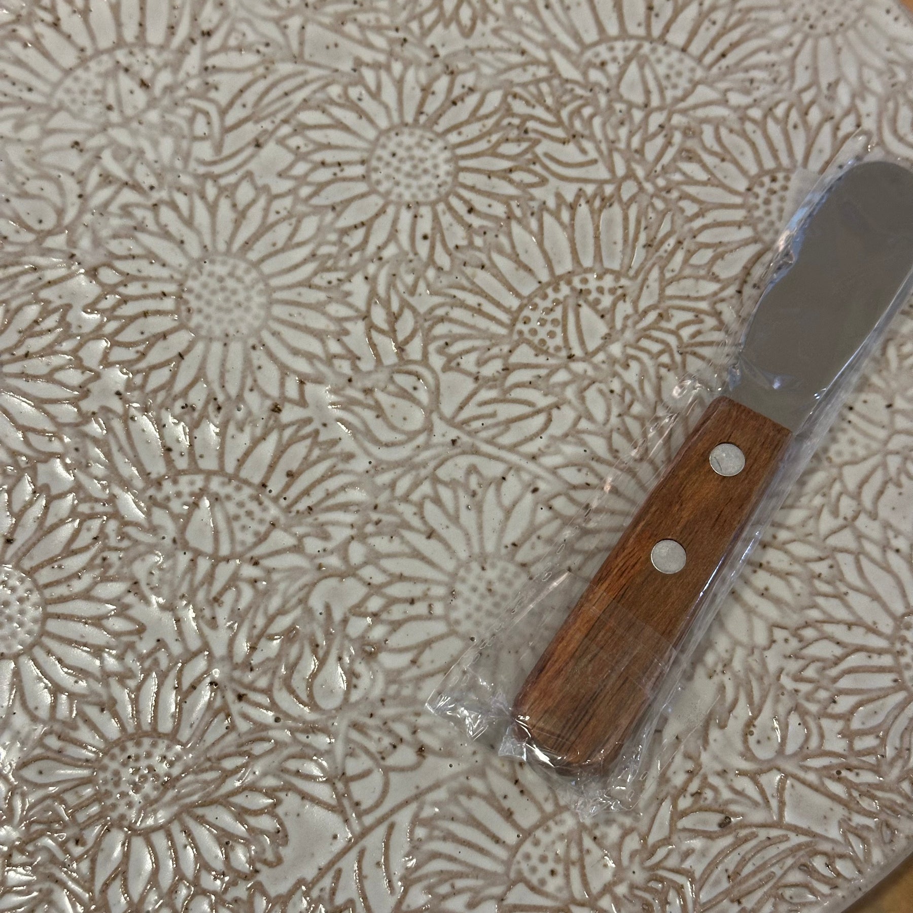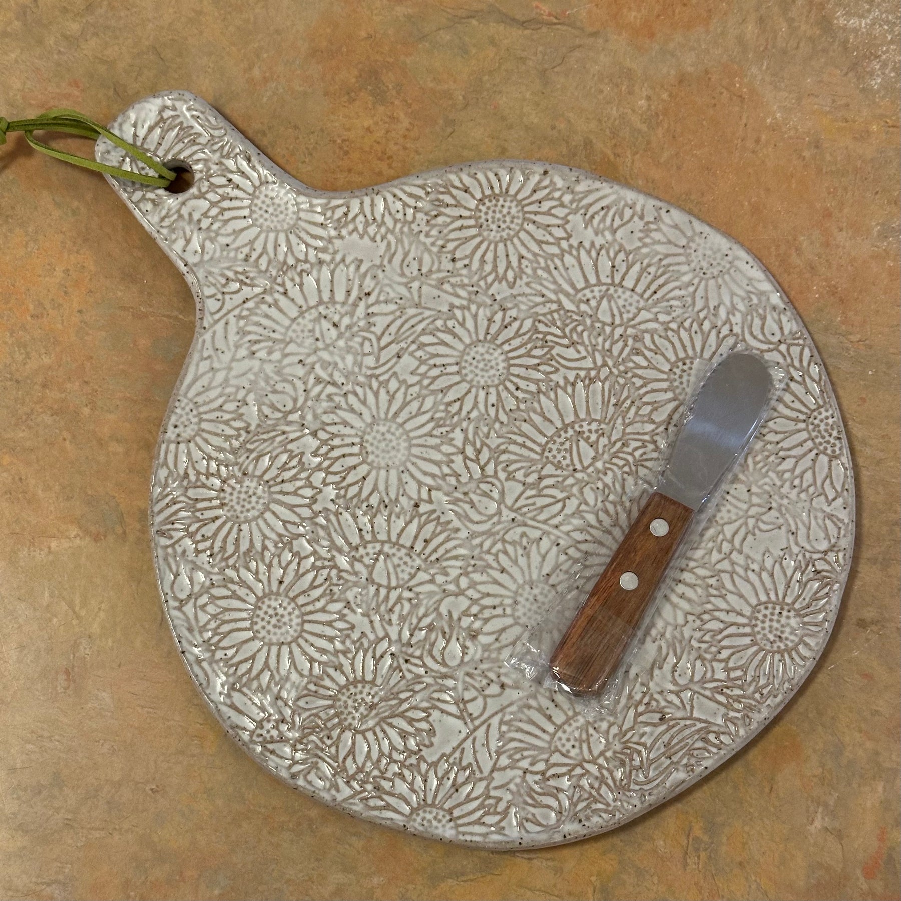 The Decorative server for cheese or appetizers is food safe and comes with a spreader and leather cord for hanging. It is embossed with a sunflower design.