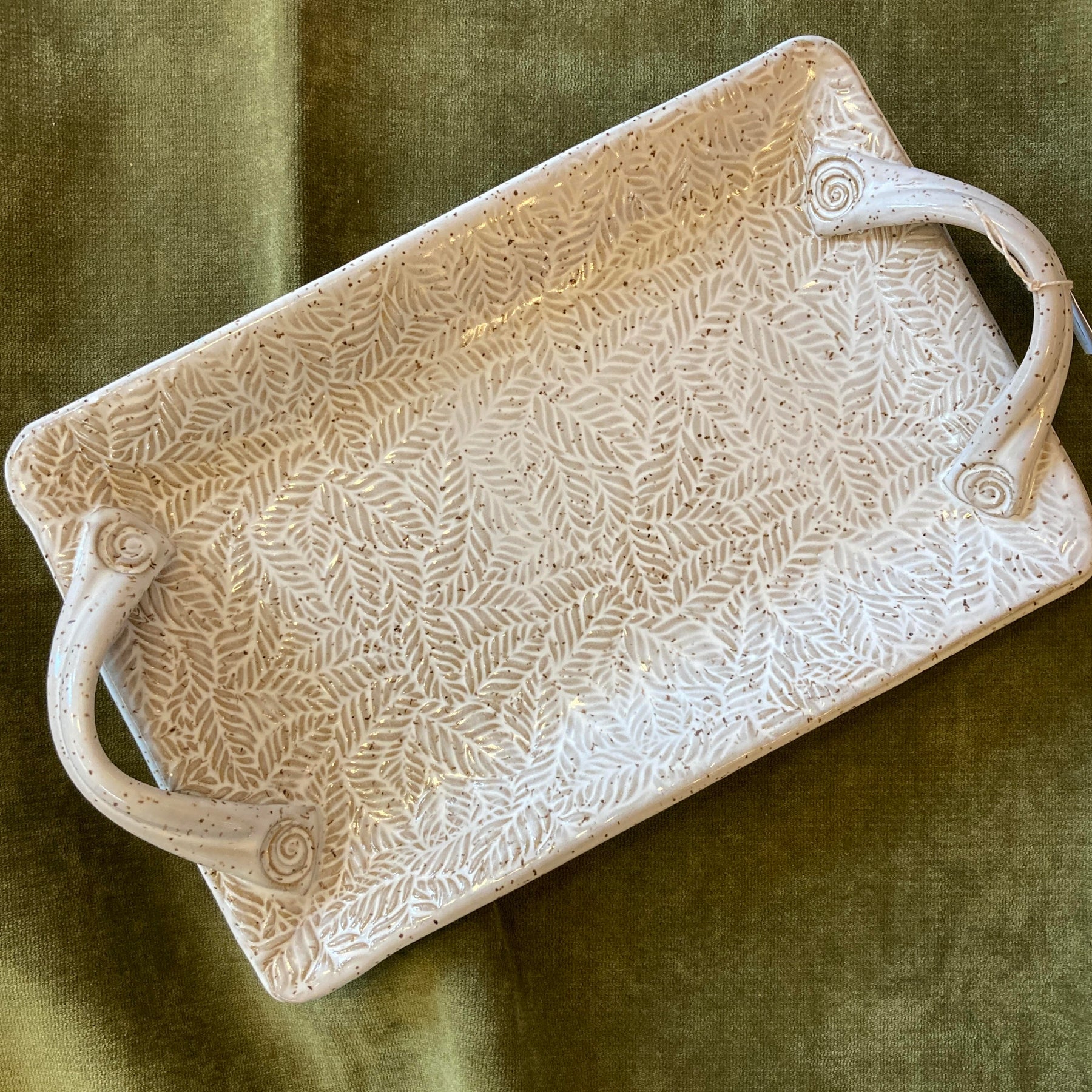 This rectangular tray features a Fern pattern with decorative handles. Perfect for dining and entertaining! Beautiful and unique, this tray is hand built and hand decorated. It is food, microwave and oven safe.