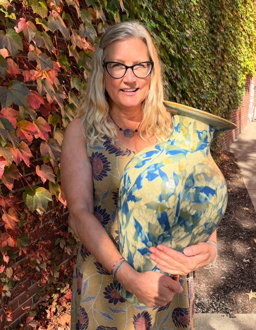 Potter and painter, work together to produce this handmade Pottery. The quintessential thing about this work is the atmospheric effects of Iron in oxygen reduction at high temperature. Many layers of oxides give the brushwork a painterly depth as oxides melt into the glaze on the very edge of melting down. Botanical imagery is painted in a gestural manner likened to impressionism, so that the feeling of light and color and movement comes alive on the surface.