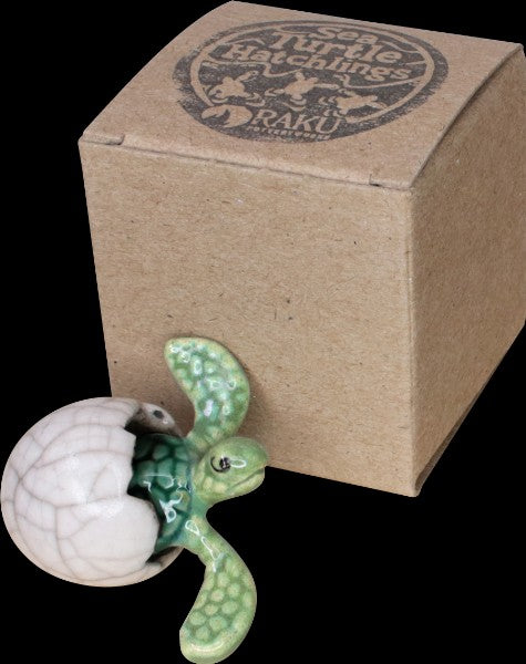 Raku is a decorative pottery created by hand and fired in an outdoor pit. The intense heat creates a crackled finished surface, appropriate to the little sea turtle's hatching shell. Due to the nature of the process, variations are normal from piece to piece.