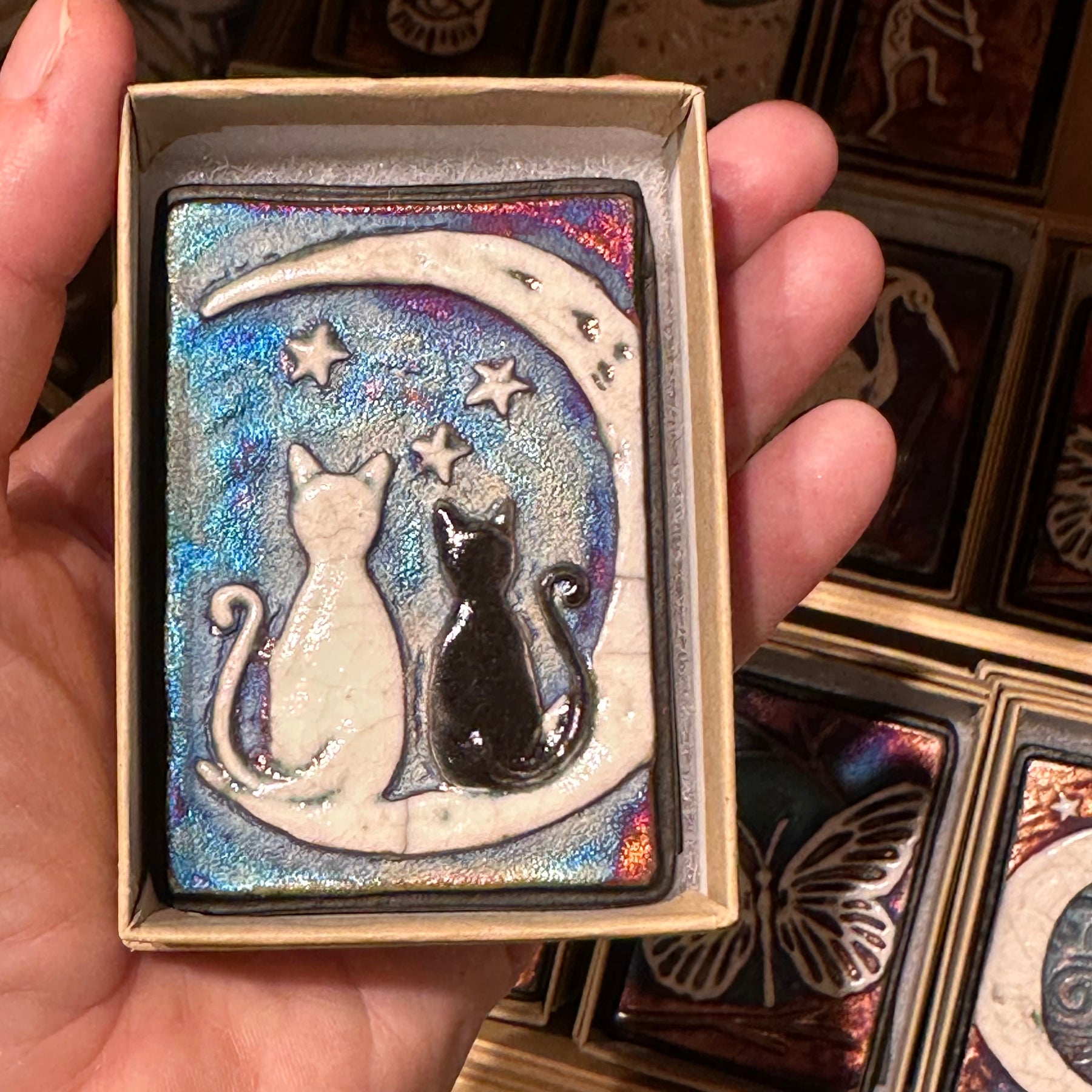 Raku is a decorative pottery created by hand and fired in an outdoor pit. The intense heat creates a blaze of colors on the finished surface. Due to the nature of the process, variations are normal from piece to piece.