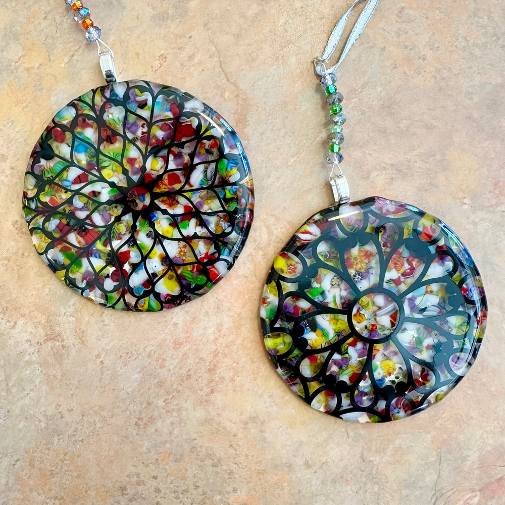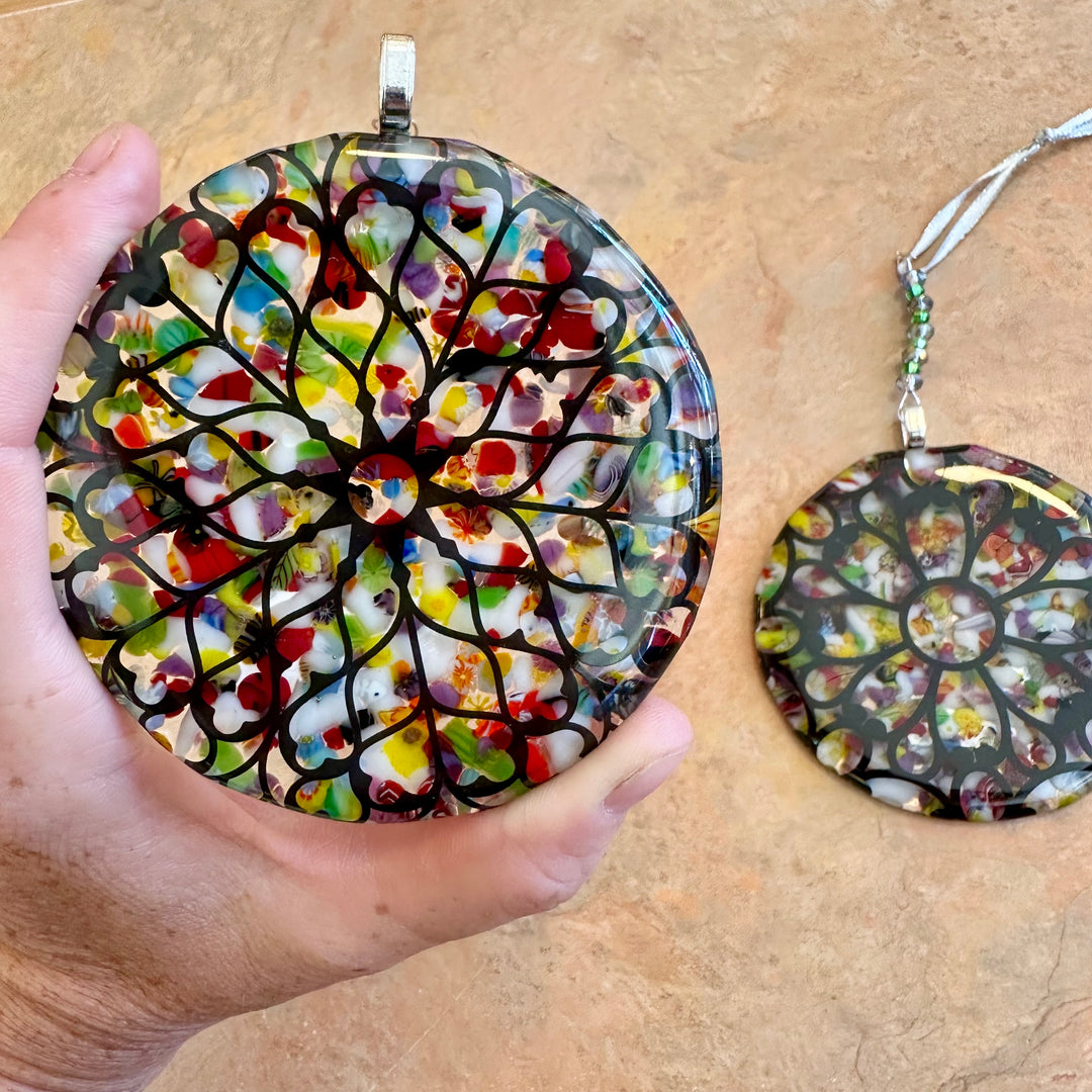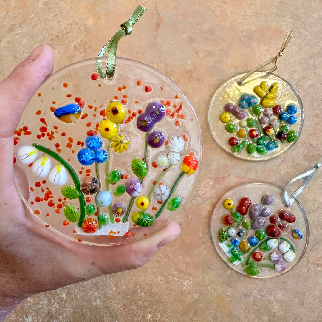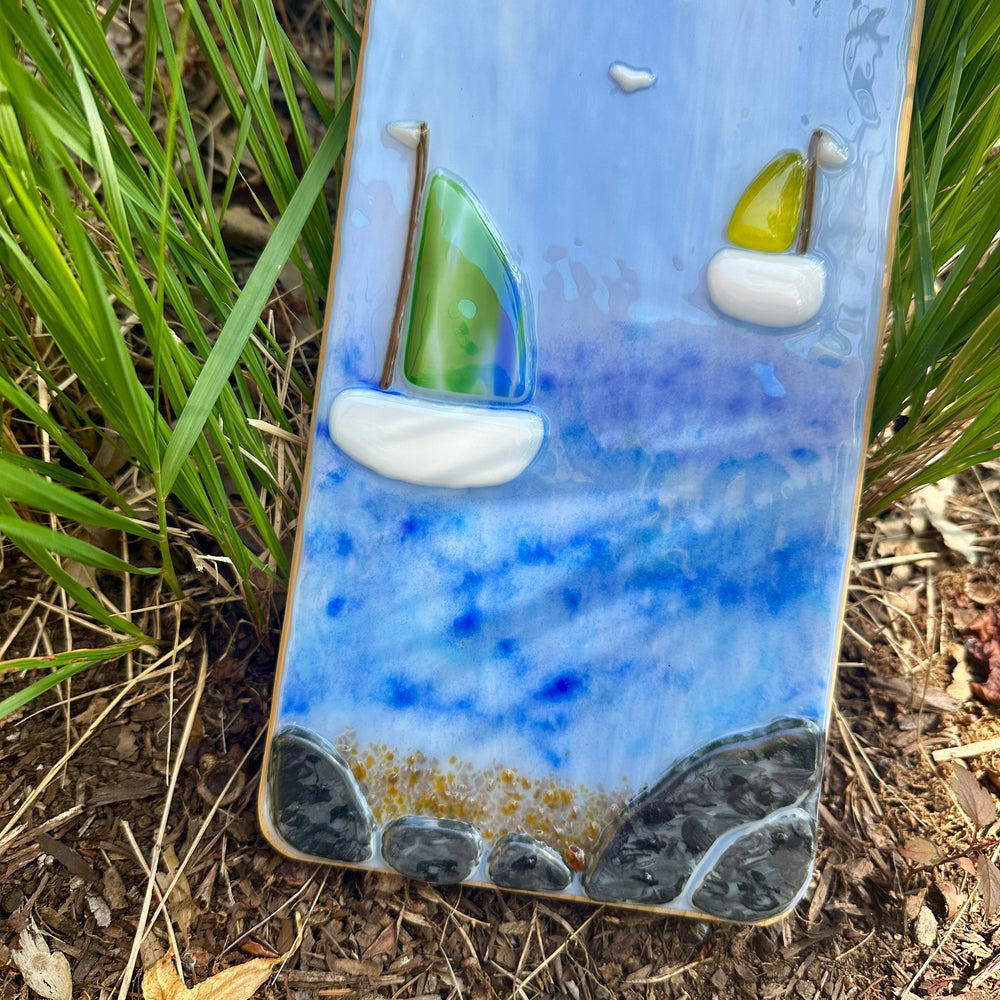 The properties of transparency, refraction, and magnification set glass apart from other art mediums. The beauty, vibrancy and durability of fused glass make it a wise choice for display or for everyday use as bowls, trays, platters, picture frames, and more. The lustrous designs reflect the dynamic play of color, tone, and density. The optics of glass can bring the illusion of movement and life to each piece. Each glass design is handcrafted and therefore unique.