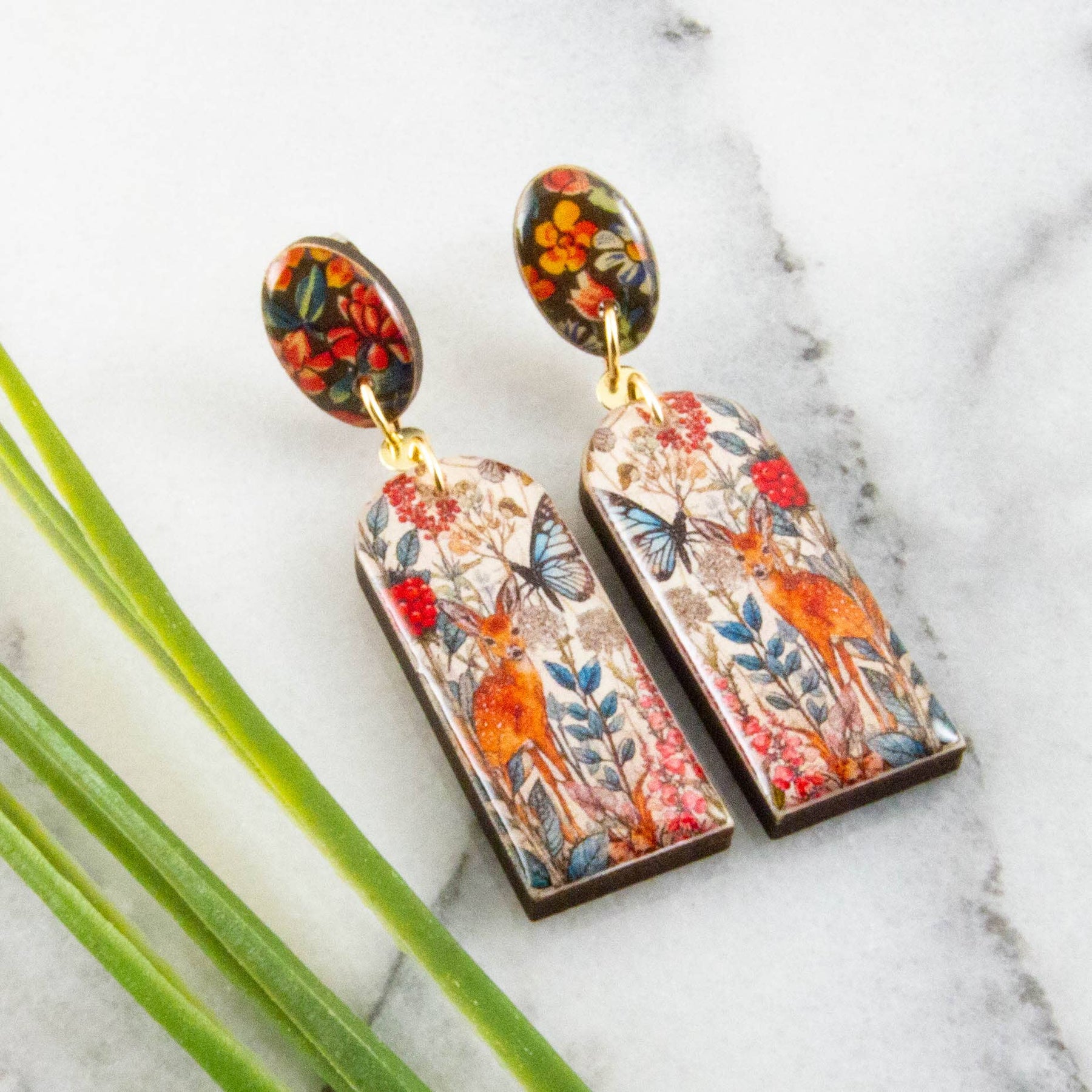 Simple and chic, these earrings are perfect for all seasons! Featuring a sweet deer in the garden scene, rendered in vivid hues. Made from sustainably sourced North American hardwood and finished with soy-based, BPA/VOC free resin, these vibrant earrings will bring joy and brightness to any wardrobe.