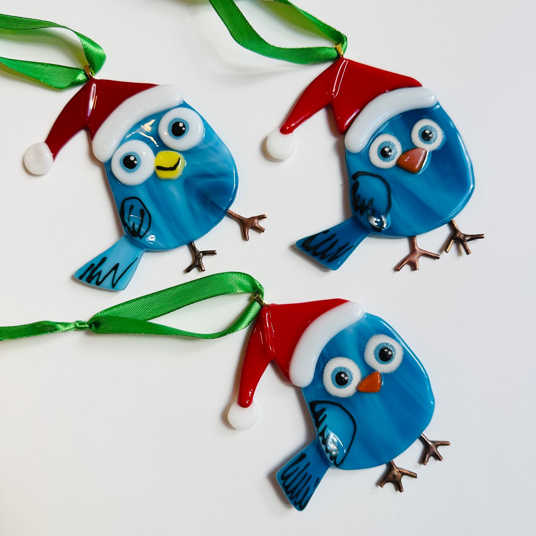 A made in Erie, PA ornament, this cute little blue bird with a red Santa hat was created with fused glass and hand painted details.