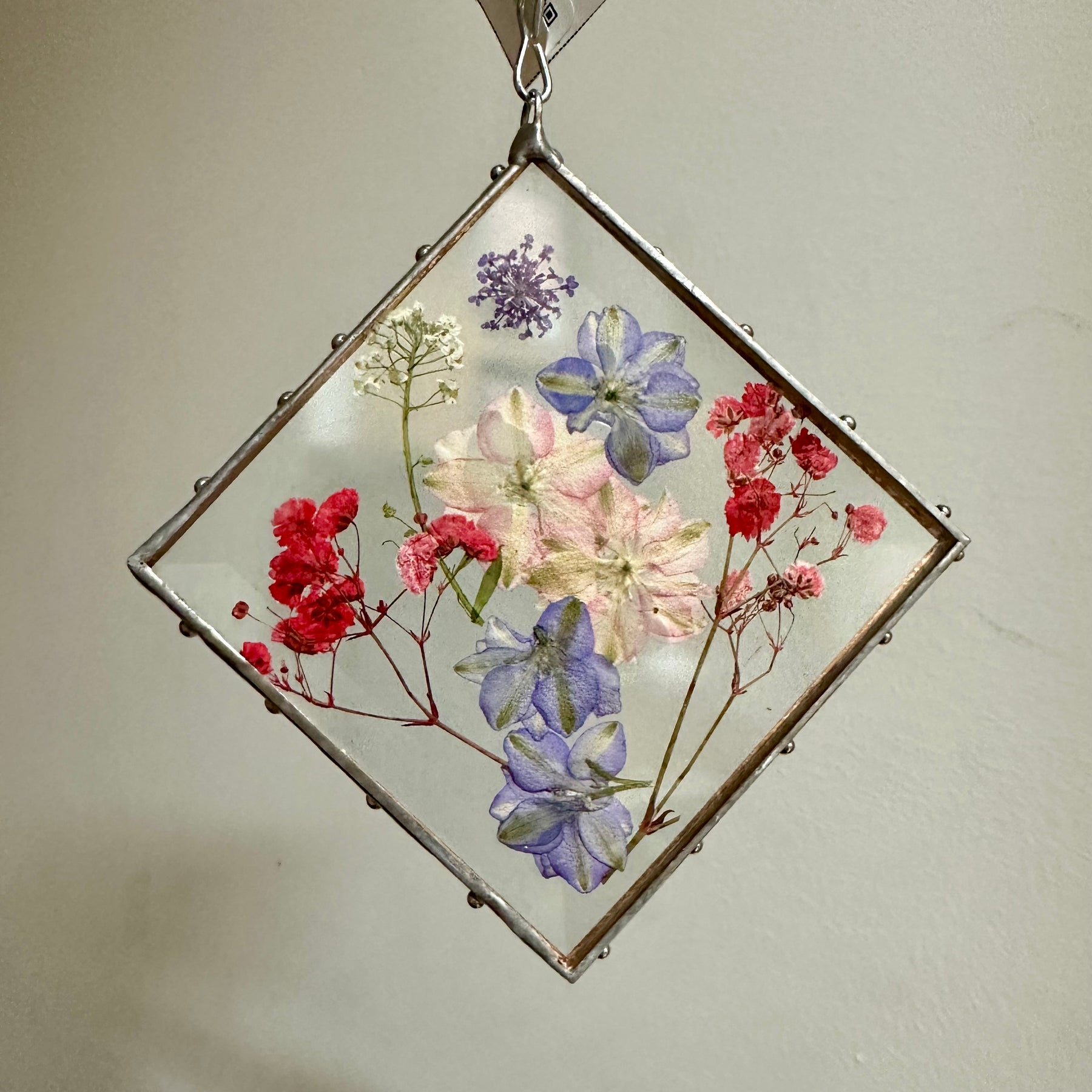 Bring the flower garden indoors year round with a Pressed Flower Picture! Beautiful pressed flowers arranged between a glass Panel and a crystal bevel, and hung from a chain. It is one of a kind! Makes a memorable gift!