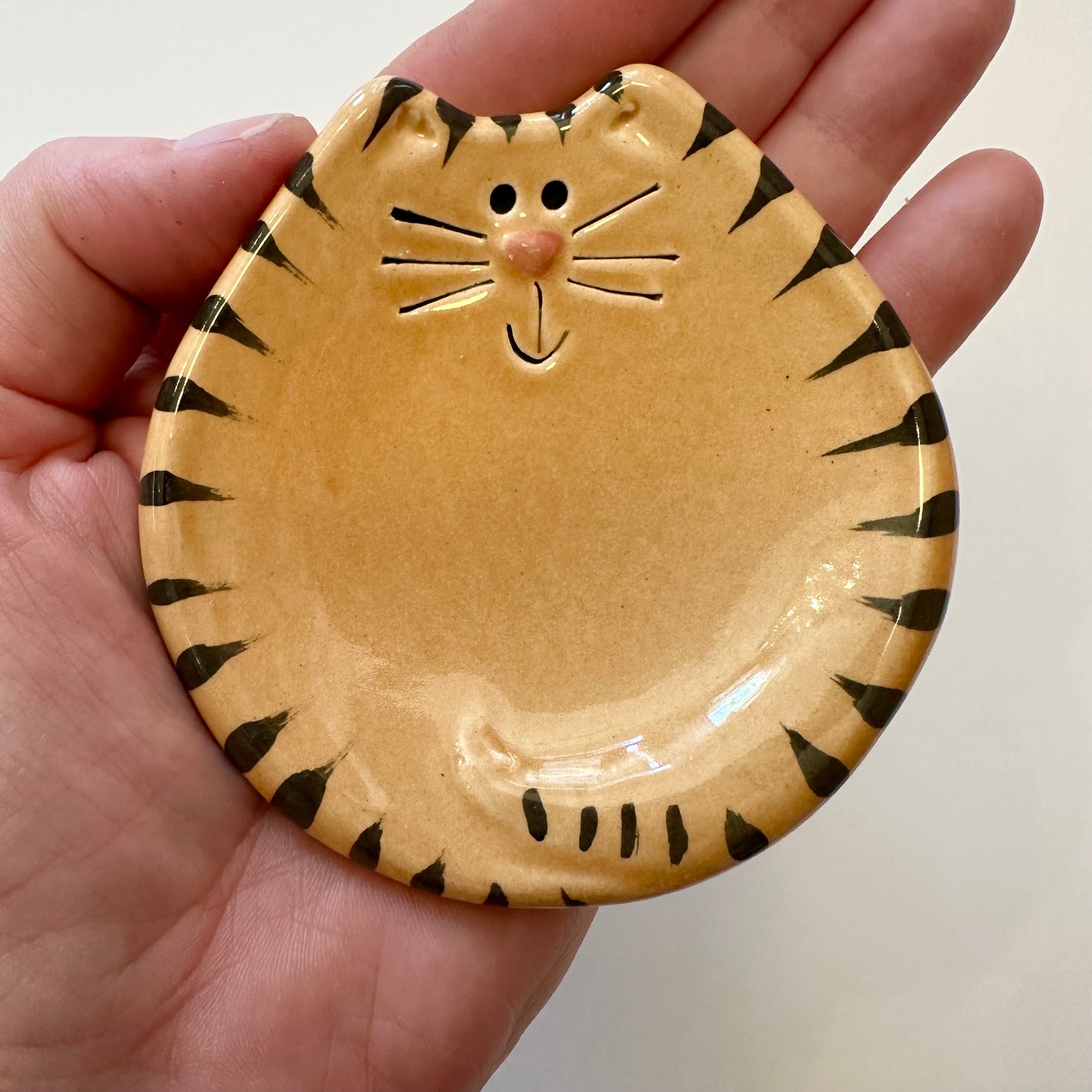 This sweet little ceramic cat dish is hand made and painted. It is commonly used as a ring, jewelry or trinket dish. It also makes a great spoon or tea bag rest, soap dish or an accent dish.