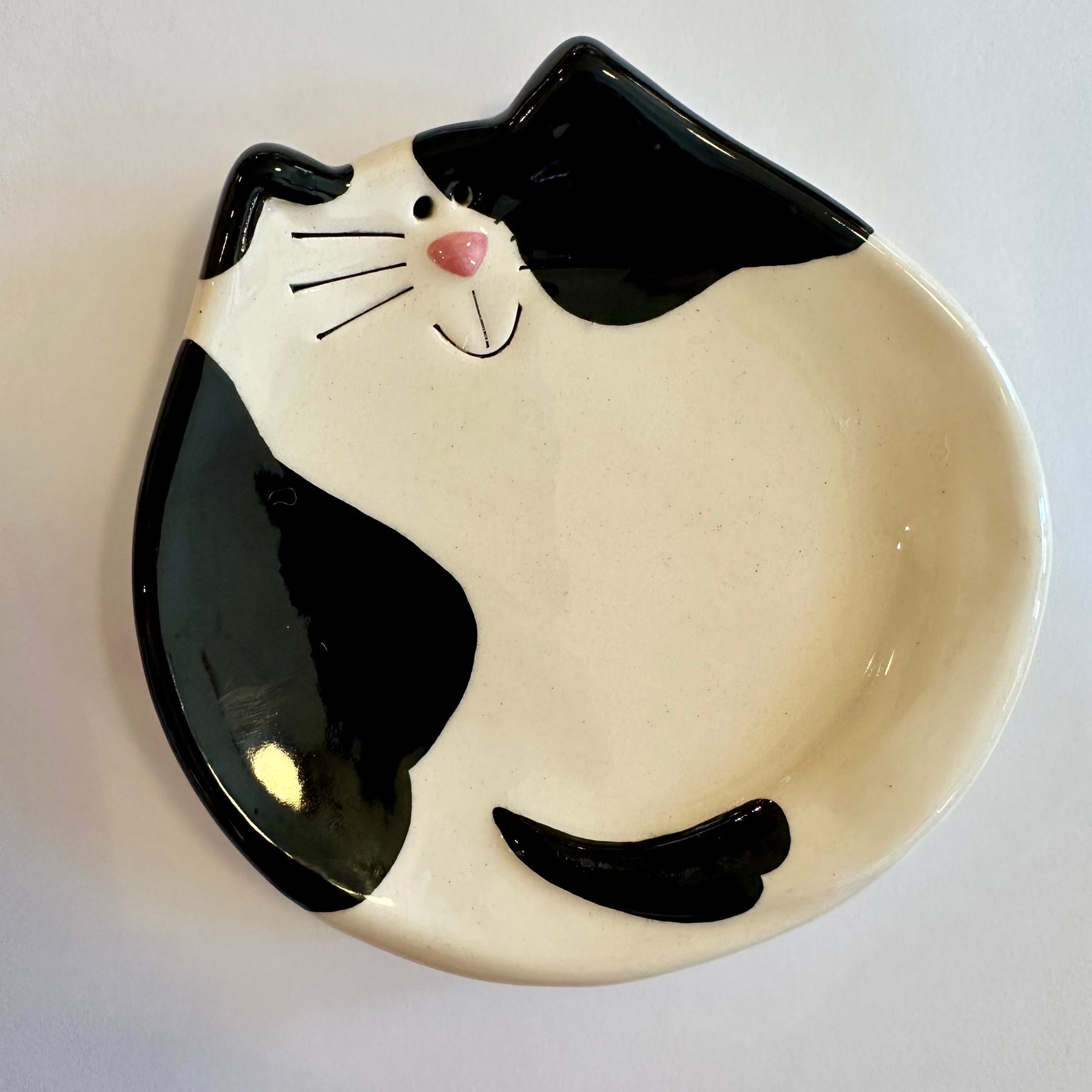 This handmade cat dish is painted with ceramic glazes. It is commonly used as a ring, jewelry, or trinket dish. It also makes a great spoon or tea bag rest, soap dish or an accent dish.
