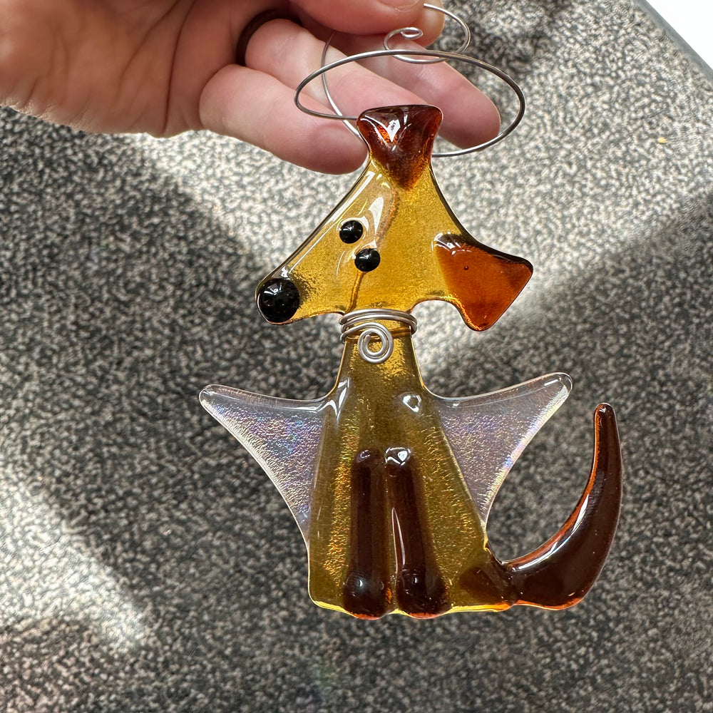 This golden angel dog ornament is perfect as a pet memorial for the furry friends lost. Angel dog is made with pale and light amber bodies with medium and dark amber ears, legs, and tail. Additionally it has two beautiful wings made from shimmery iridescent glass. Angel dog is finished with a wire wrapped halo, perfect for hanging in the window or on a Christmas tree. As all are handmade, the ear, nose, eyes, and tails will all vary leaving each pup to truly be unique.