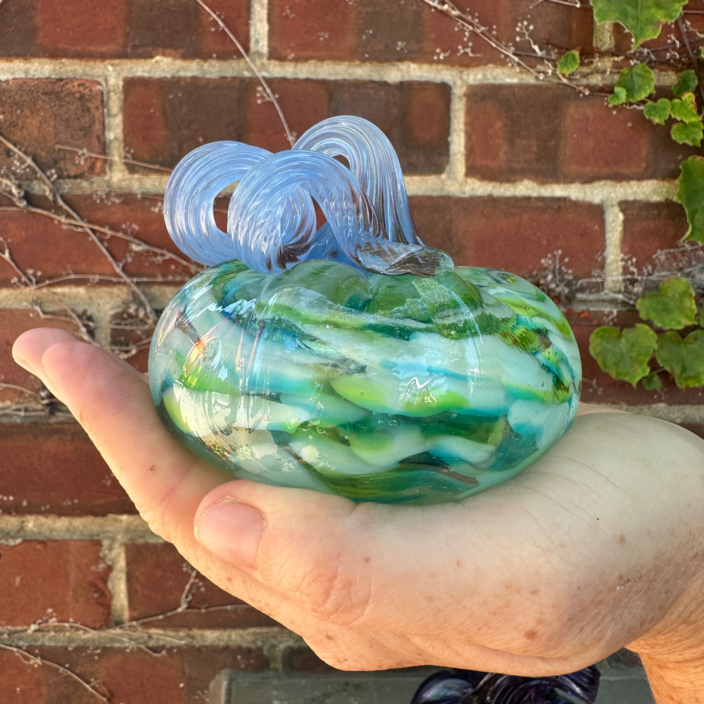 Handblown locally, this pumpkin features a rich White + Purple body with a Purple stem. Group with additional pumpkins for a striking centerpiece.