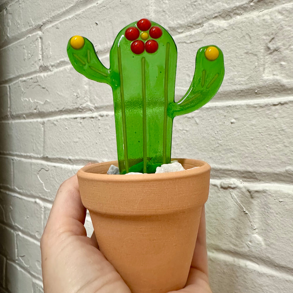 This whimsical fused glass potted cactus with a glass flower on green glass is a perfect item for a desk, window ledge, shelf or dresser. It truly adds fun to any room!