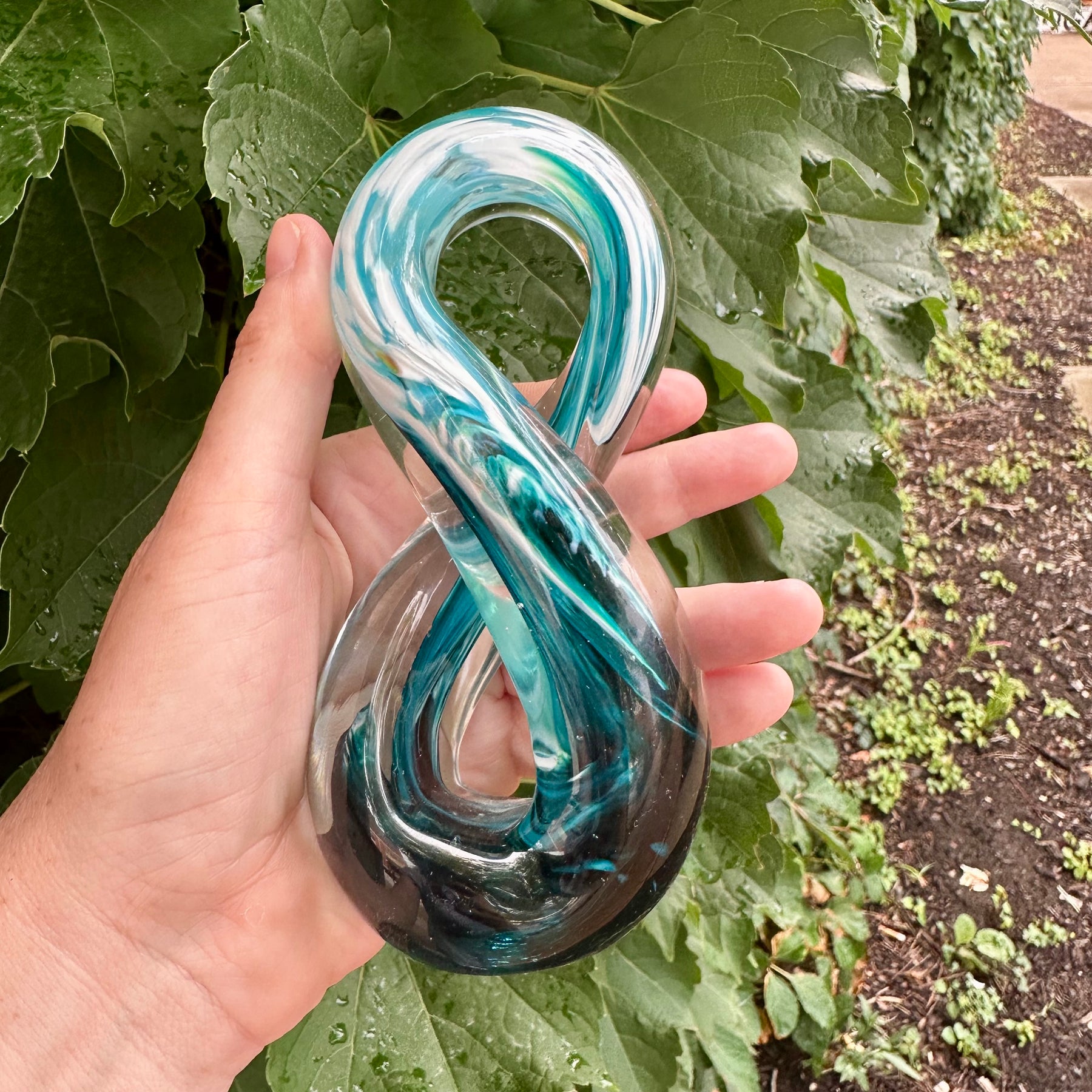 Decorative hand formed glass sculpture with a white and teal core, twisted to resemble an infinity symbol. A meaningful gift!