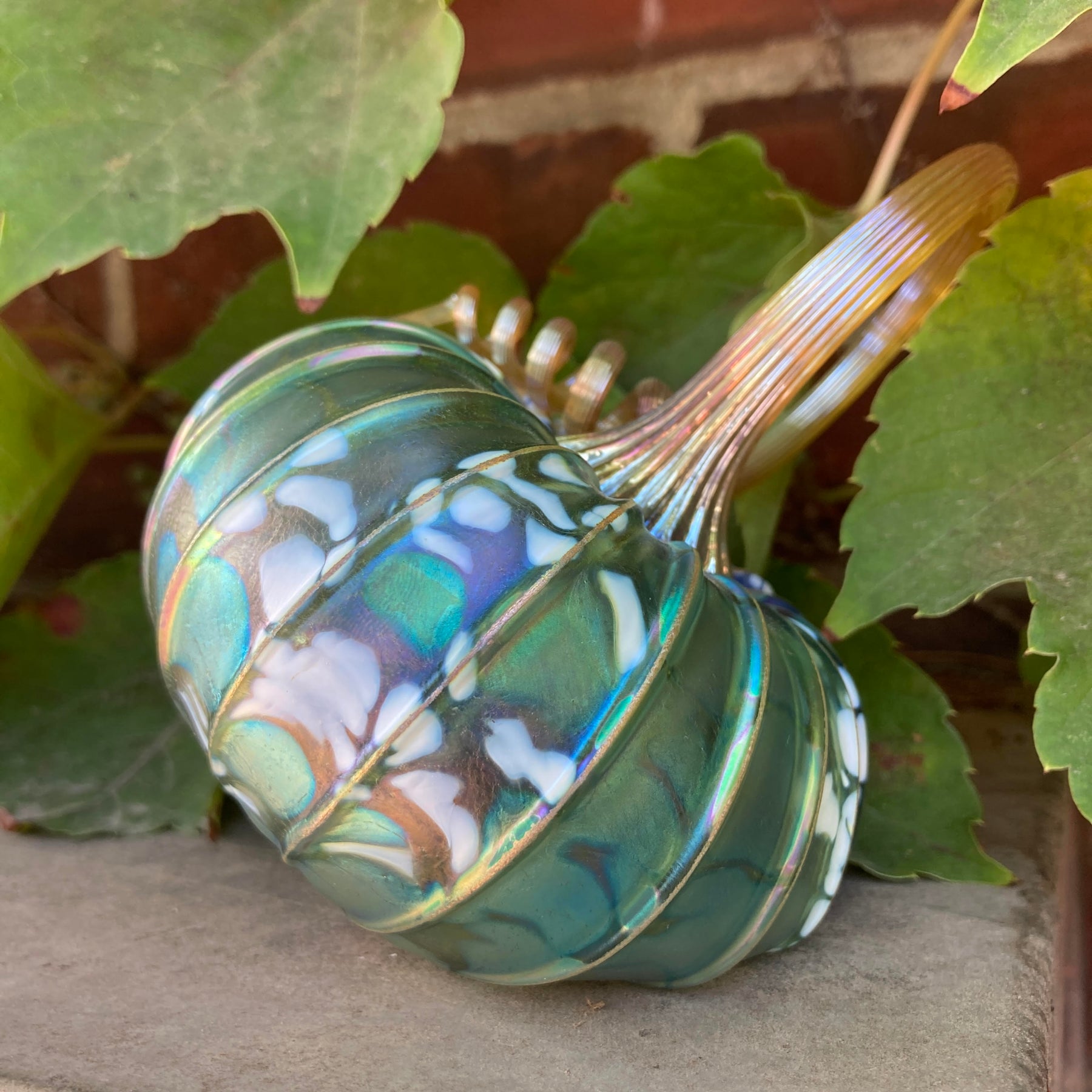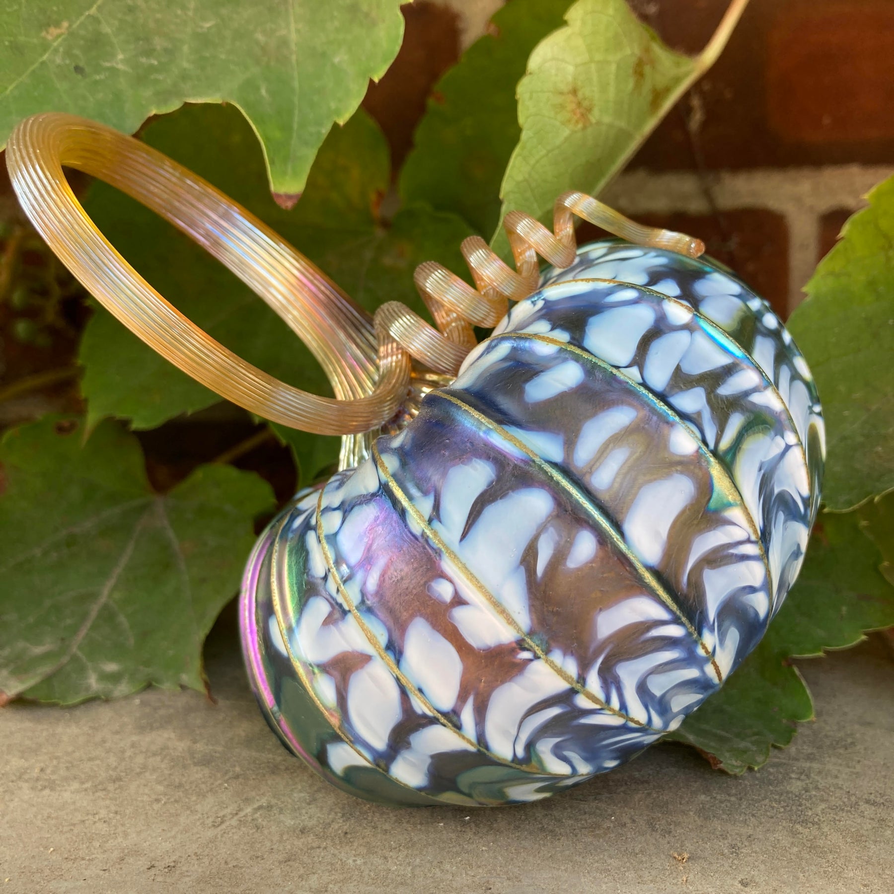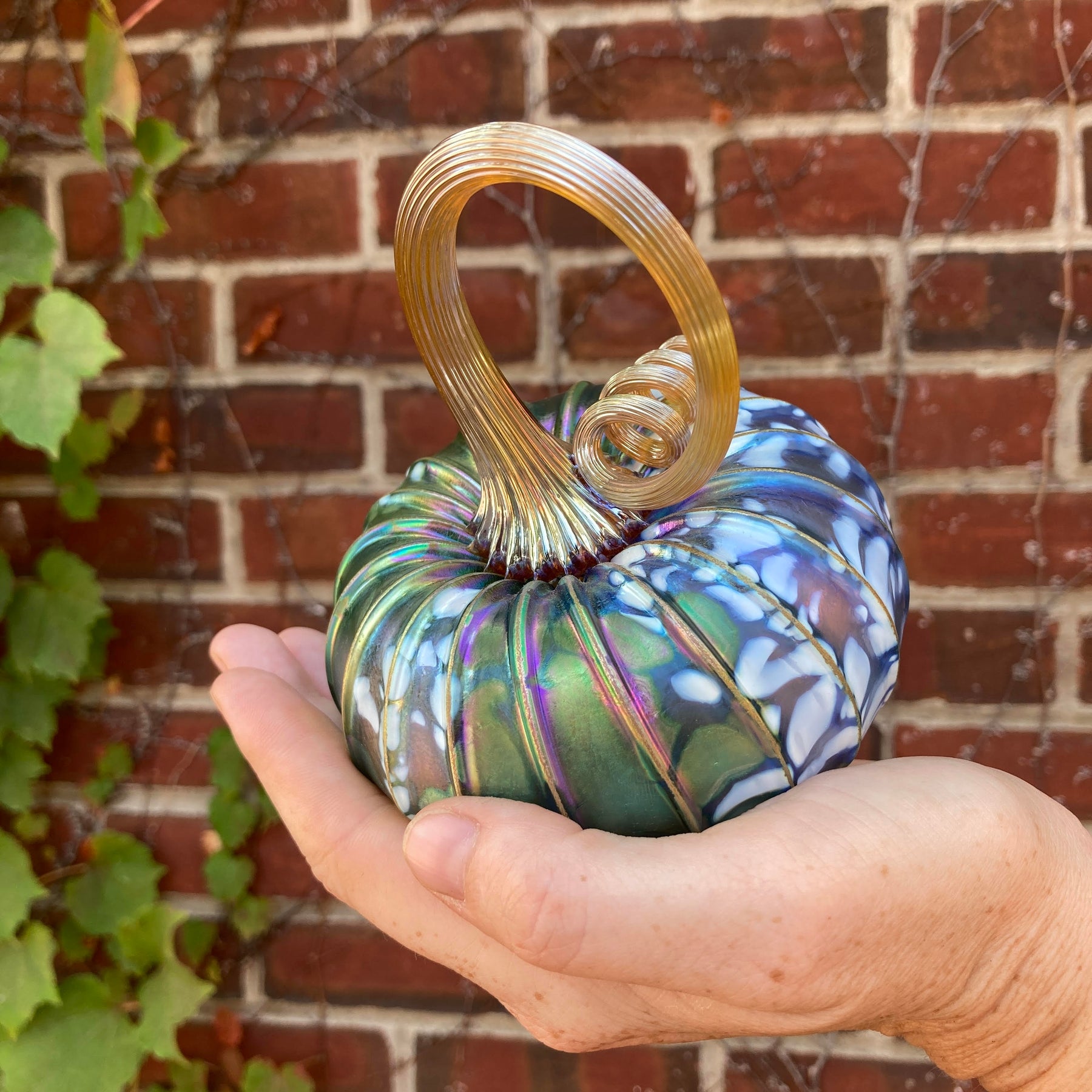 This pumpkin is hand blown at 2000 degrees. Jack Pine Studio in Hocking Hills, starts with just a small gather of clear glass and then they create their designs with layers of colored enamels and precious metals. No paints are used at any time during the process. Each pumpkin is unique because of their incredibly rich colors and textures.