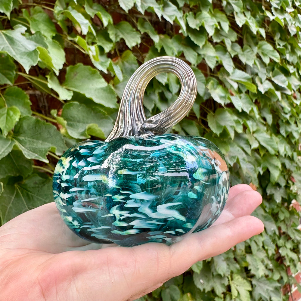 Handblown locally, this pumpkin features a rich teal and white body with a metallic stem. Group with additional pumpkins for a striking centerpiece.
