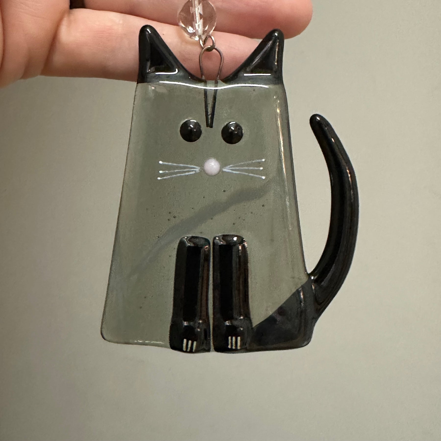 Adorable grey fat cat sun catcher or holiday ornament. Great for all year! Perfect gift for cat lover or Vet. These cat bodies are made using specialty glass, so each one of these will be truly unique based on the piece of glass used. The glass is a combination of streaks and swirls of multiple colors so each will look slightly different. Ears, feet and tail will be in a complimenting purple shade. Hand drawn whiskers make each cat slightly varied. The cat is finished with a wire hook and bead.