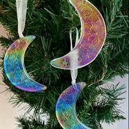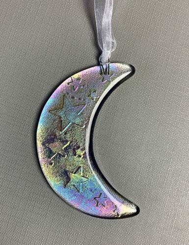 This crescent moon is made with fused clear iridescent glass so that it shimmers in a window light or by the lights on a Christmas tree.