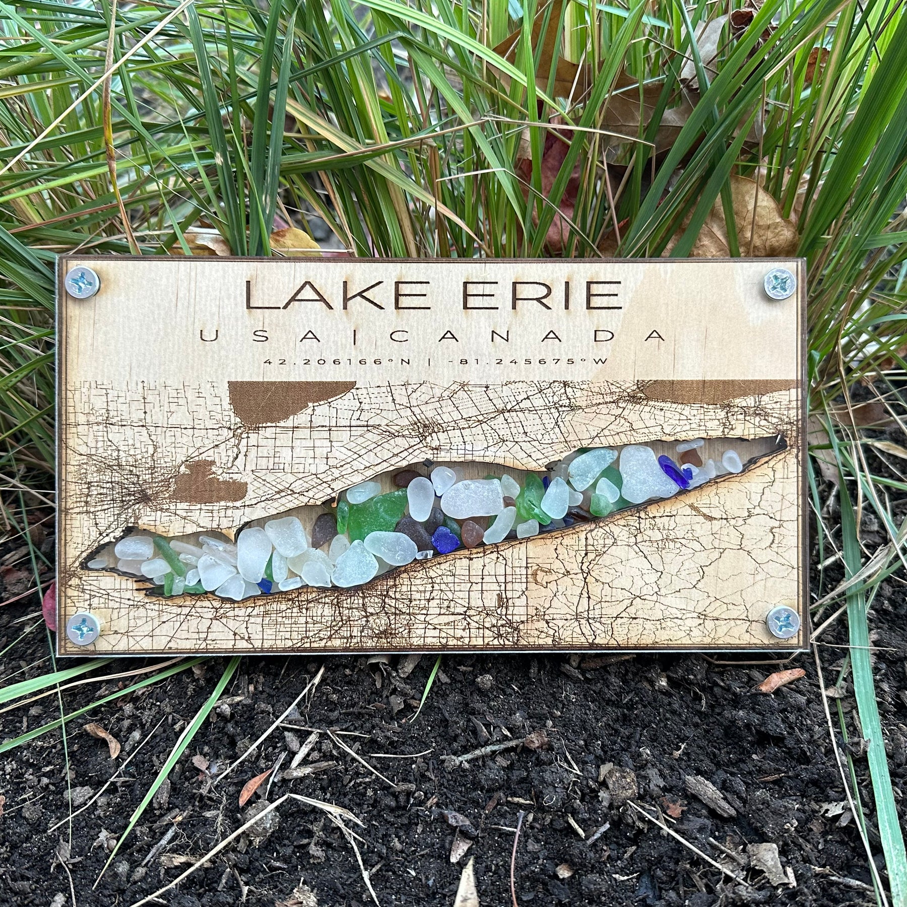 A unique spin on a map, this wooden engraved piece is filled with genuine Lake Erie Beach Glass. Finished with an acrylic covering to make a lasting gift sure to please any lake lover!