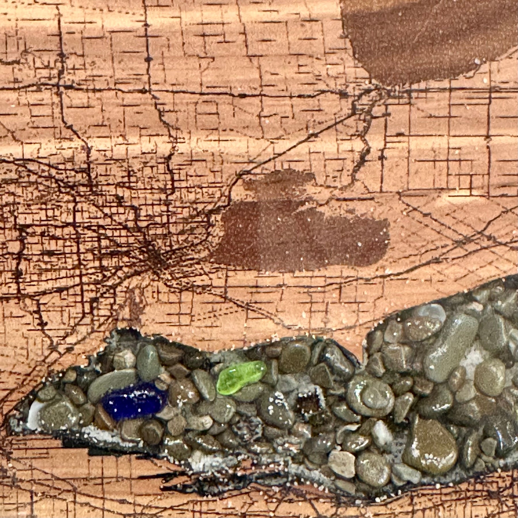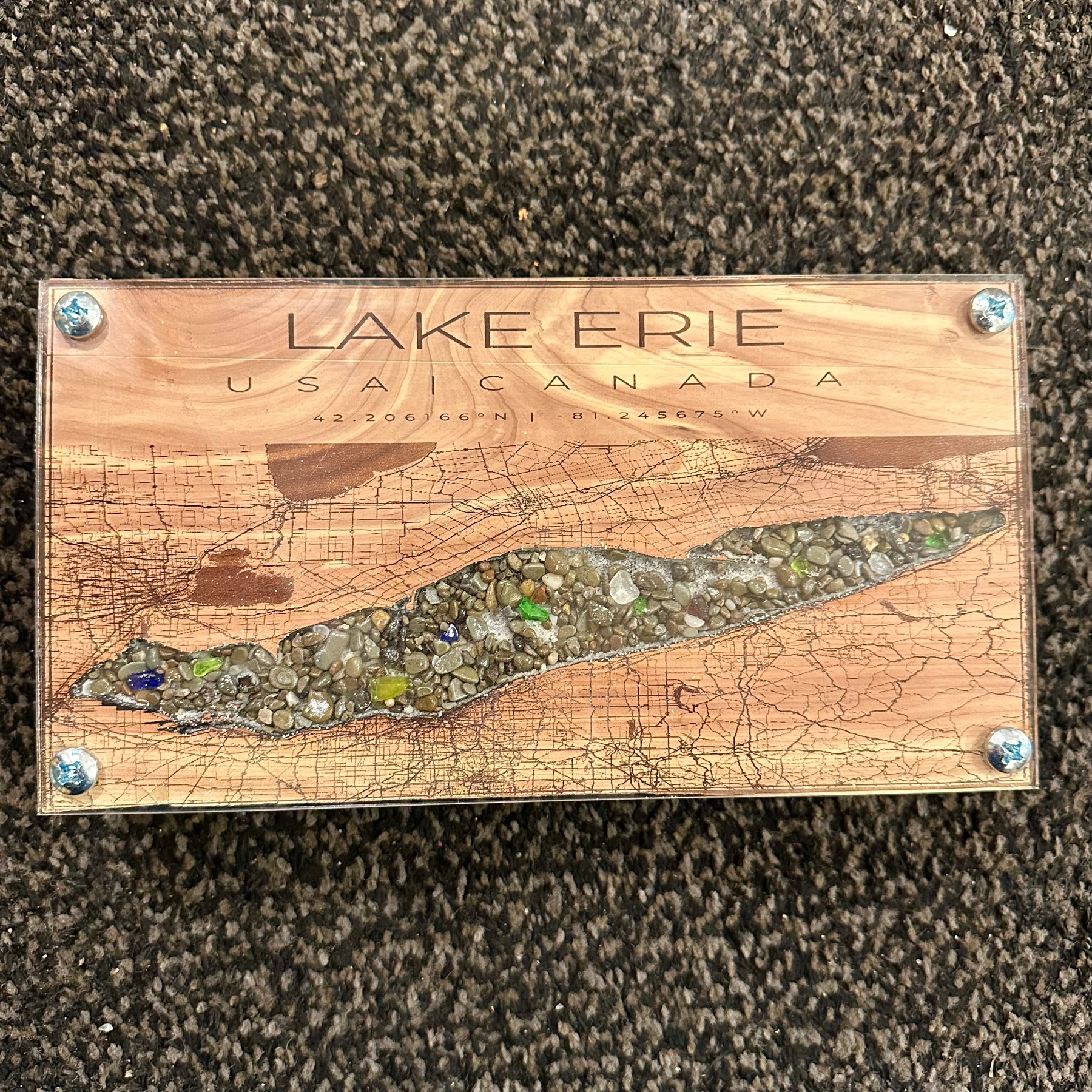 A unique spin on a map, this wooden engraved piece is filled with genuine Lake Erie Beach Glass and stones. Finished with an acrylic covering to make a lasting gift sure to please any lake lover!