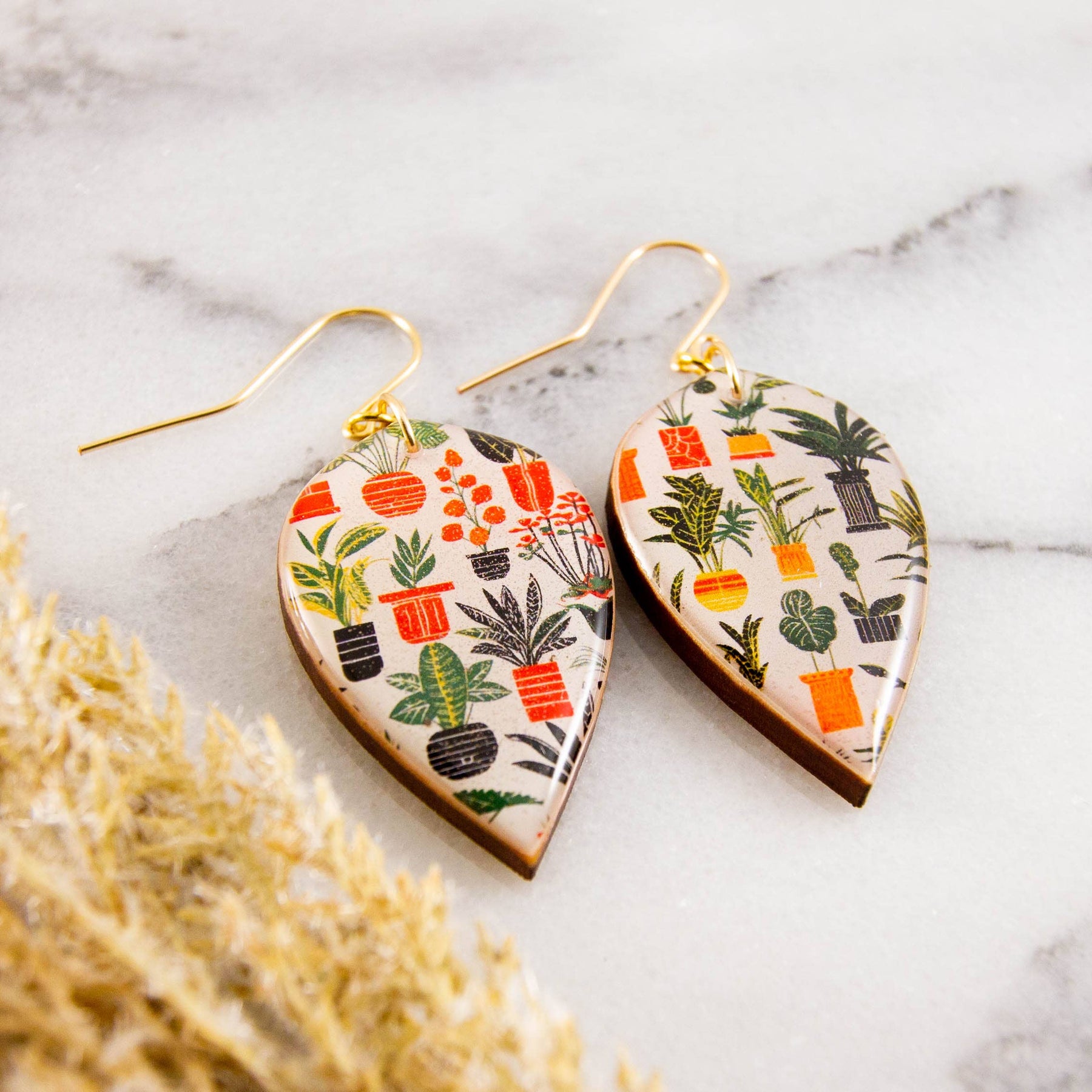 The perfect statement earrings for everyday wear! Featuring a retro inspired houseplant illustration, rendered in shades of green, orange, and black. Made from sustainably sourced North American hardwood and soy based BPA/VOC free resin and finished with handmade gold filled ear wires.