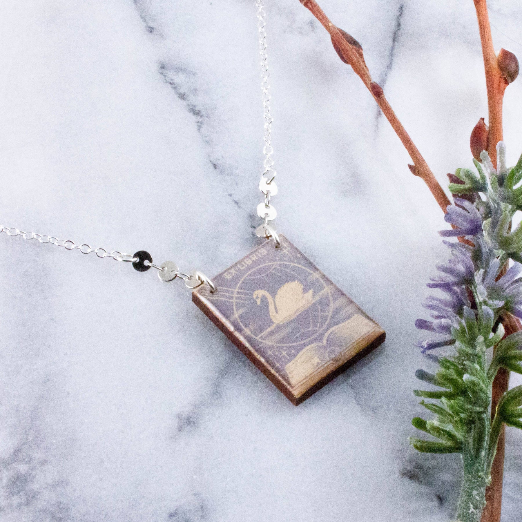 This vintage ex libris bookplate pendant is a perfect gift for your favorite bibliophile. It features a delicate swan motif in soft shades of cream and grey and is made from sustainably sourced North American hardwood, finished with soy based, BPA/VOC free resin and polished silver plated chain and disc detail.