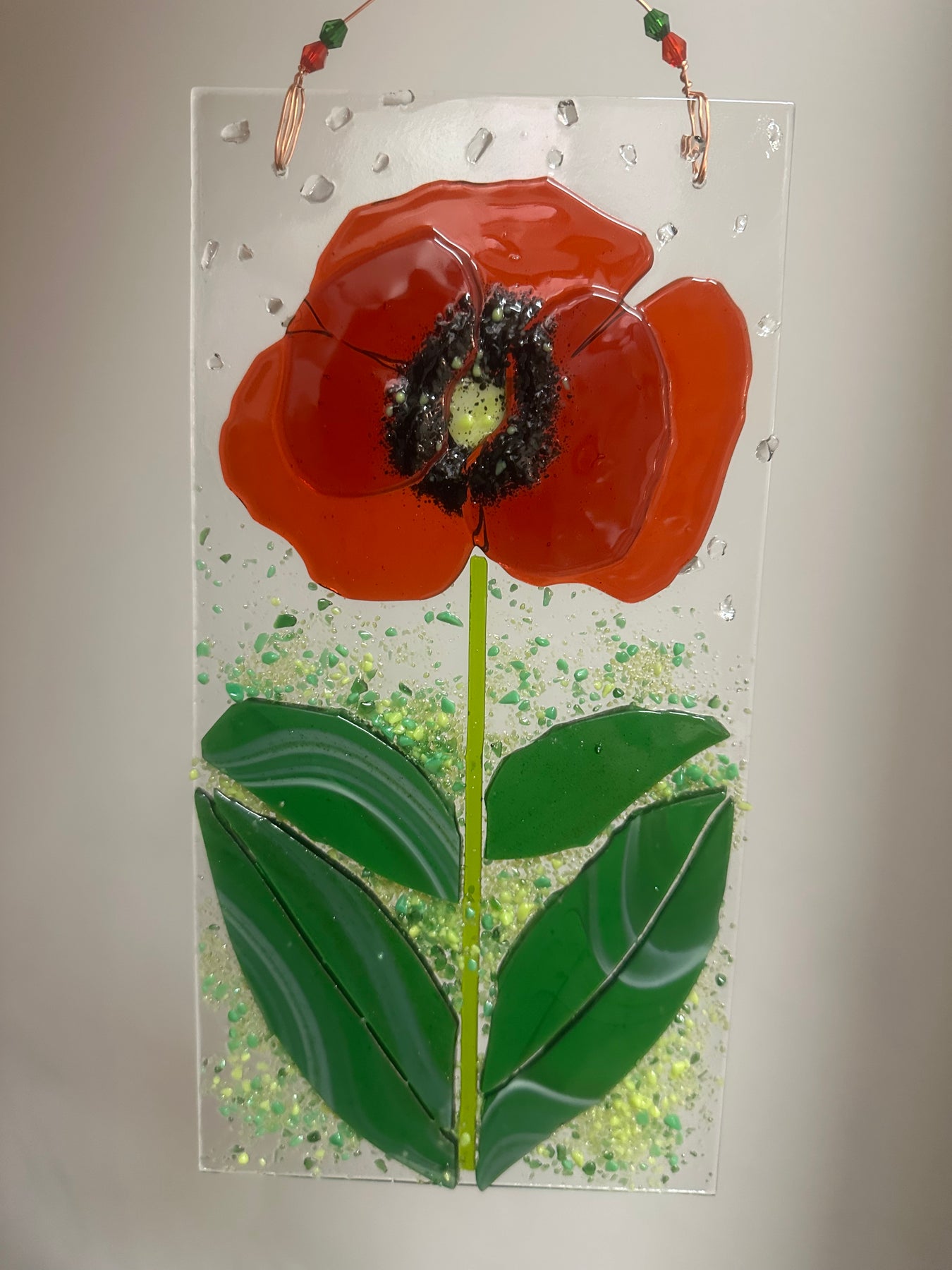 A vibrant suncatcher, this rectangular poppy will light up a room all year long. Wired for easy hanging.