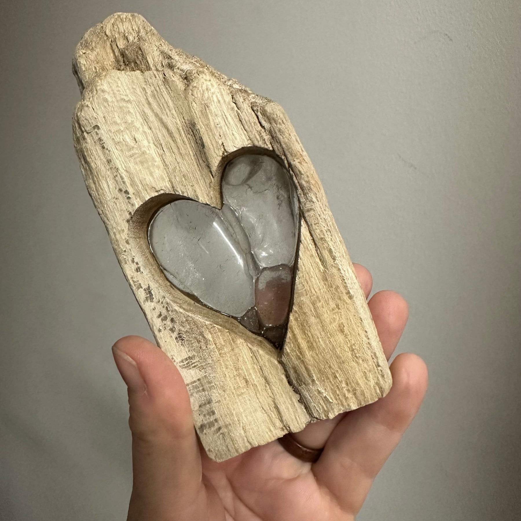 This one of a kind sculpture is free-standing and created from a carved piece of Lake Erie driftwood. The hearts is filled with a layer of clear beach glass and resin.