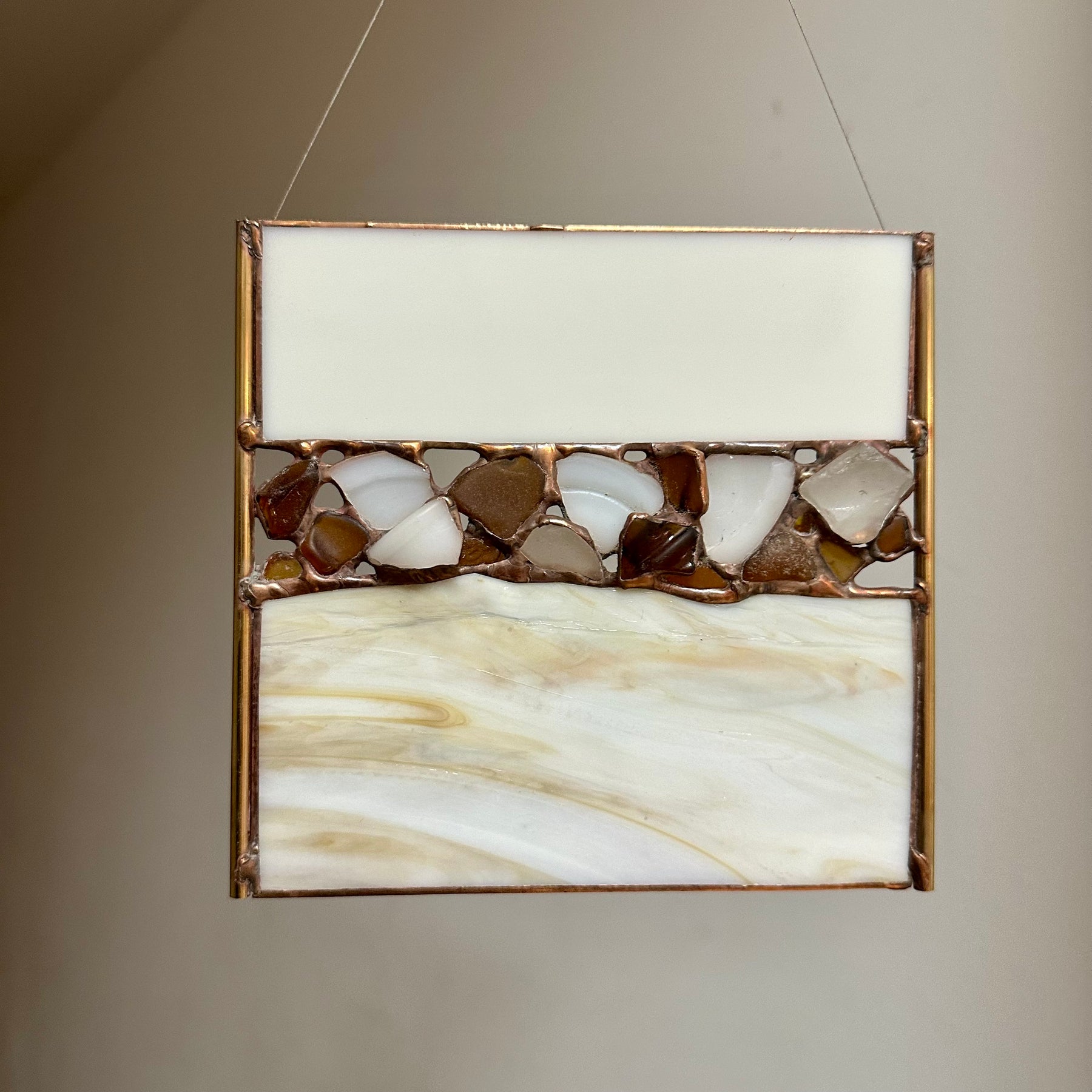 Decorative glass panel with genuine Lake Erie beach glass and vintage milk glass accents. Copper solder lines and Brass Rod frame.