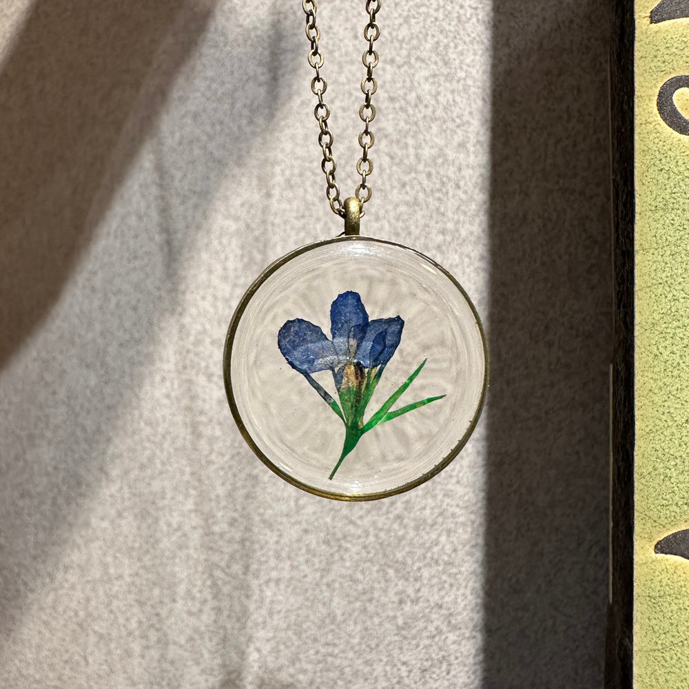 This Pressed botanical necklace has flowers that are sealed in layers of Resin in a round bezel.