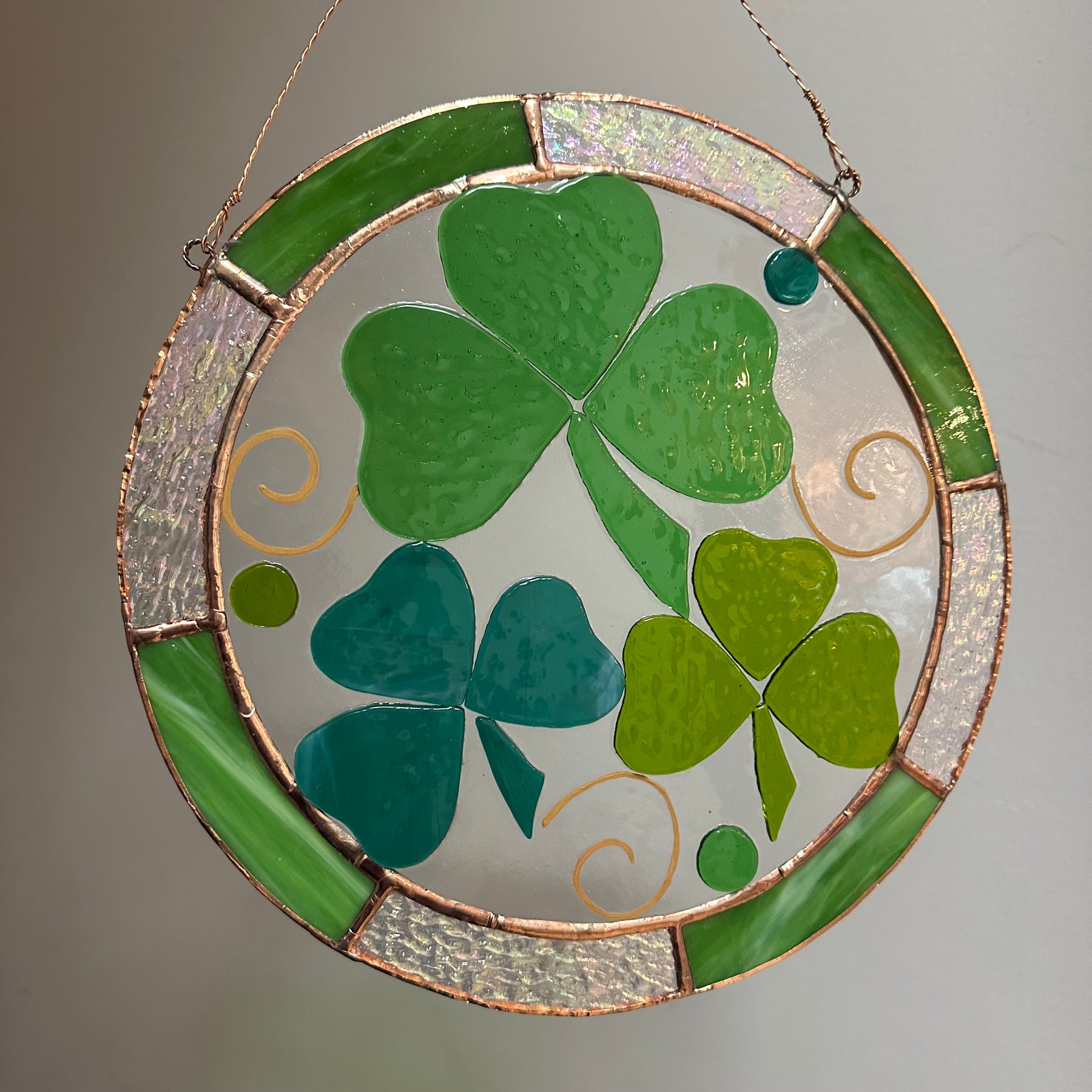 This window hanging captures the beauty of Shamrocks in a stained glass frame with a fused glass center. This suncatcher can also be displayed in an easel.