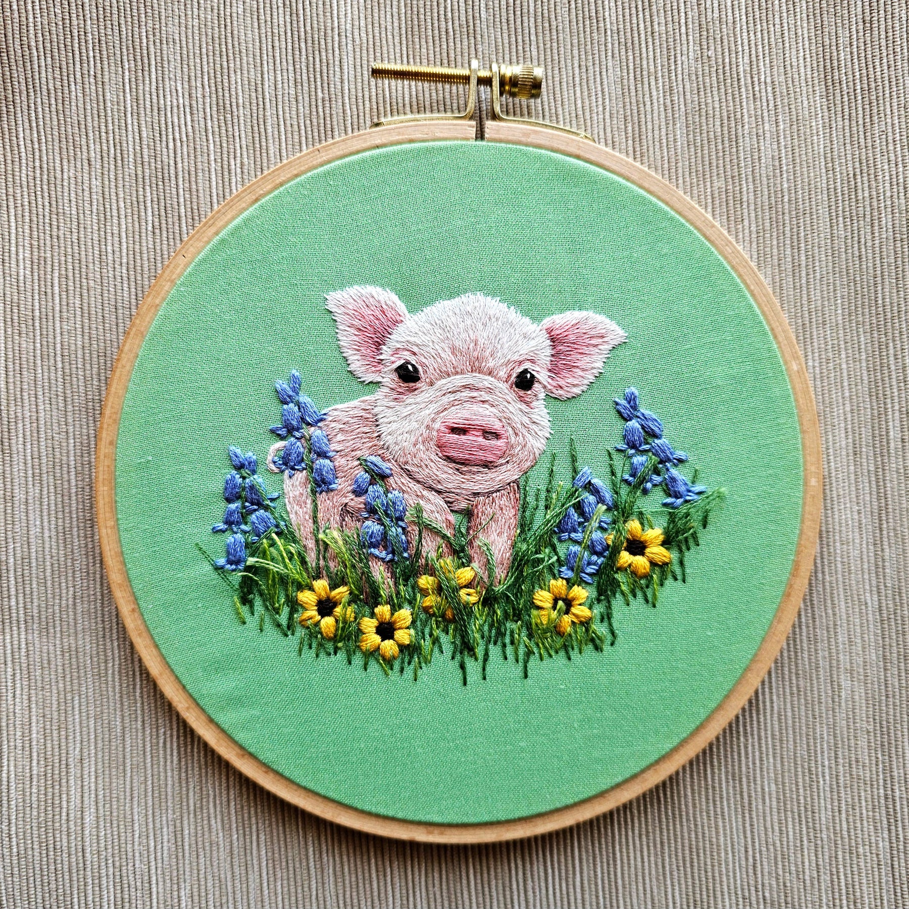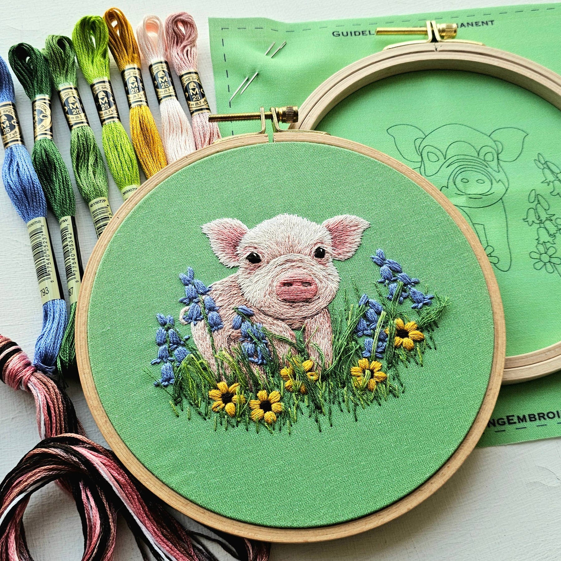 Grab this kit to get everything you need to stitch up your own adorable piglet in a field of daisies and bluebells.