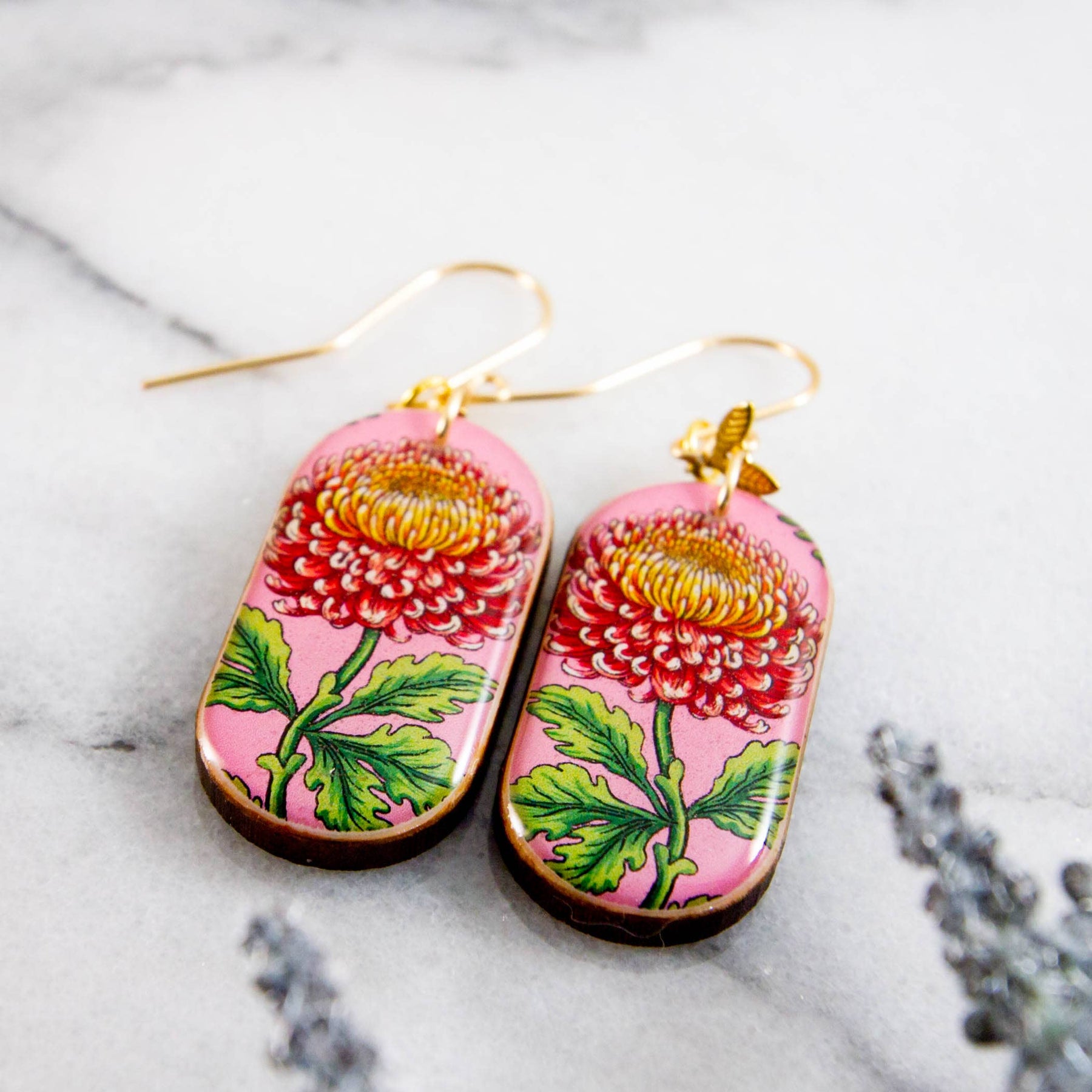 These charming earrings are a celebration of spring! Featuring a vintage inspired chrysanthemum flower illustration, rendered in shades of pink, yellow, and green. Made from sustainably sourced North American hardwood and finished with soy-based, BPA/VOC free resin, these vibrant earrings will bring joy and brightness to any wardrobe.