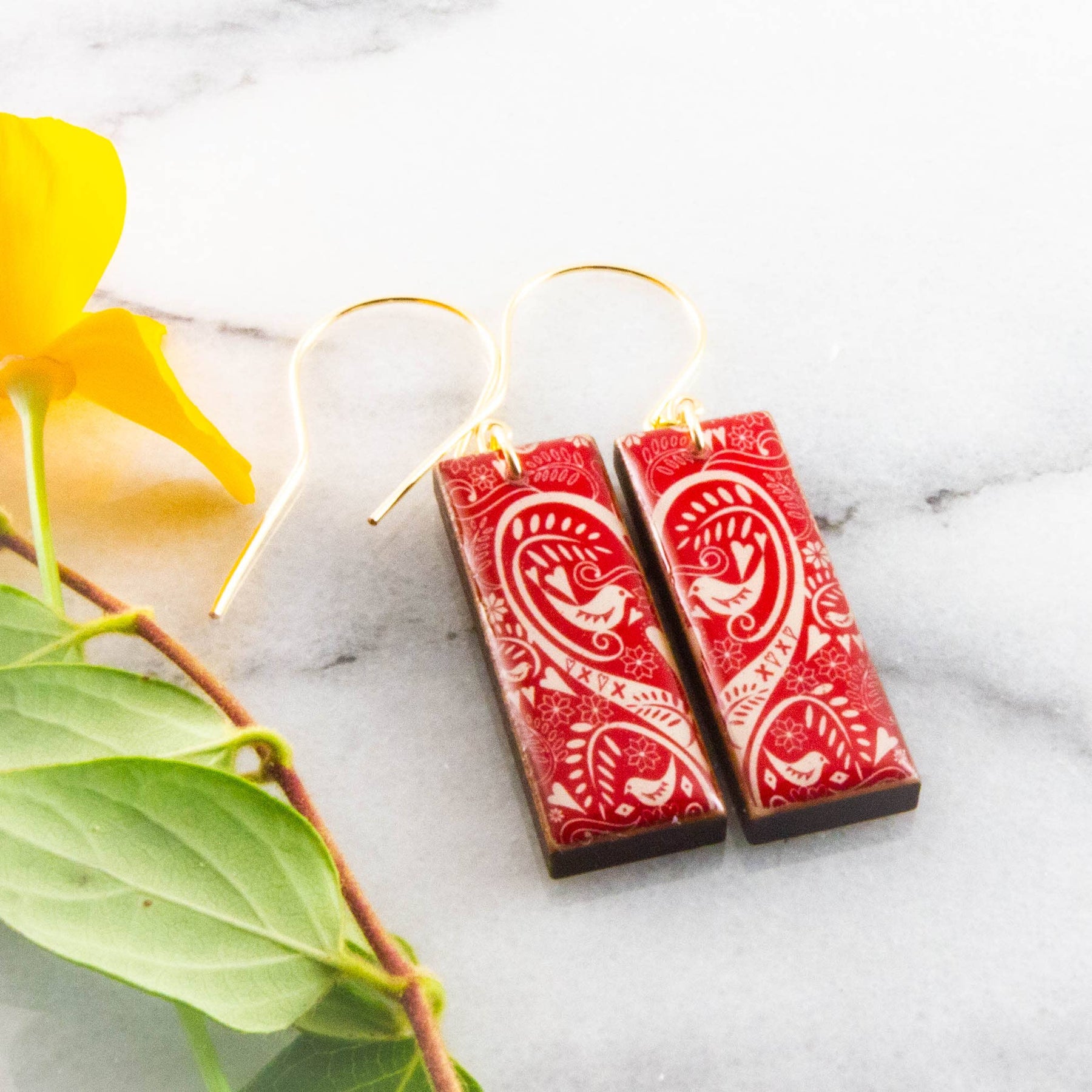 Red + White Scandinavian Bird Rectangle Earrings