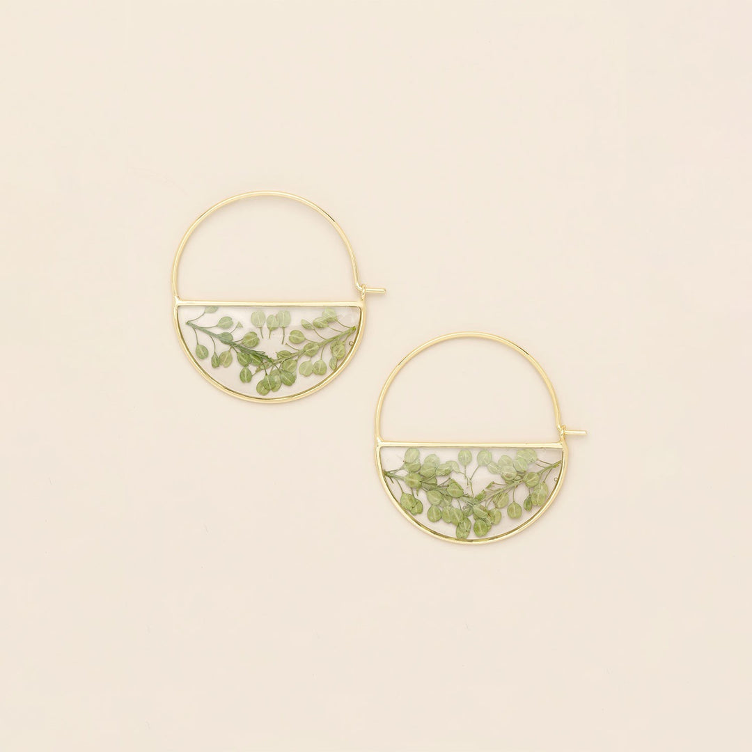 Pressed Flower Hoop Earring Green Peppergrass Gold
