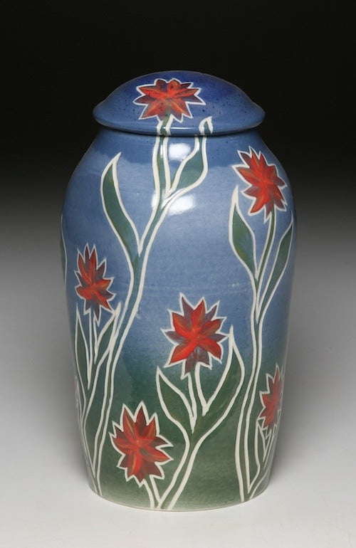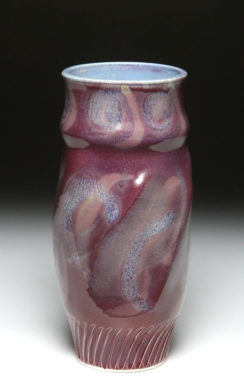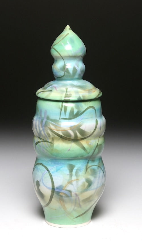 Tom’s current ceramic work involves a number of styles, clay bodies, firing methods and even some incorporated wood elements. One series using porcelain involves wheel thrown and hand built additions. Decoration includes sprayed and brushed layers of underglazes, porcelain slip and carved designs, some that are decorative and others incorporate animal or figurative imagery. Carved textures emulate the surface of each creature including the scales on fish and lizards or feathers on birds. Many of the carving tools are altered with files to incorporate the appropriate texture. A variety of glazes provide complex surface and color variations and translucent glazes allow both the underglaze and carving to be subtly revealed. The teapot form is a never ending challenge of form, proportionf and surface interpretations.
