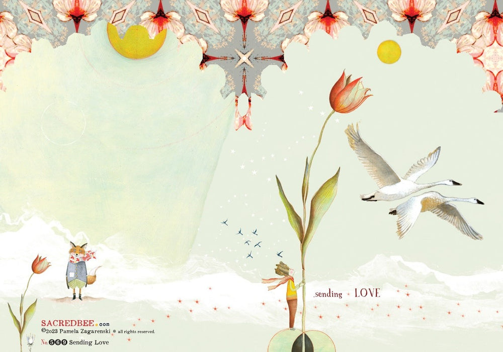 The Sacredbee artist believes in choosing words that encourage, promote peace, love and have lasting meaning. She believes in caring about each other, future generations and our incredible diverse planet including all of its creatures feathered, furred, finned, winged, four-legged and two.