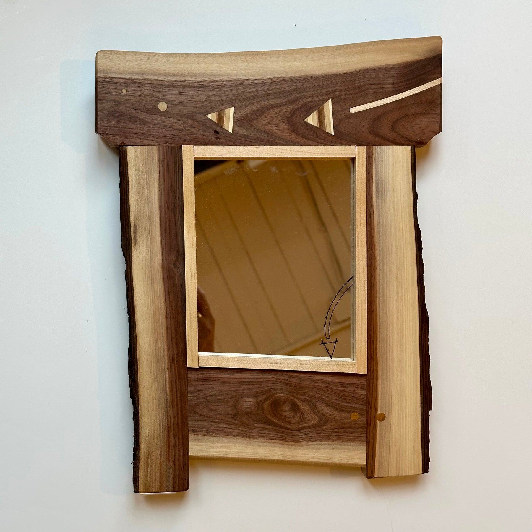 This handmade mirror was created in Pittsburgh, PA with wood from naturally fallen trees and recycled mirror. The inlay details, raw edge and mirror detail make this a truly one of a kind, functional piece of art.