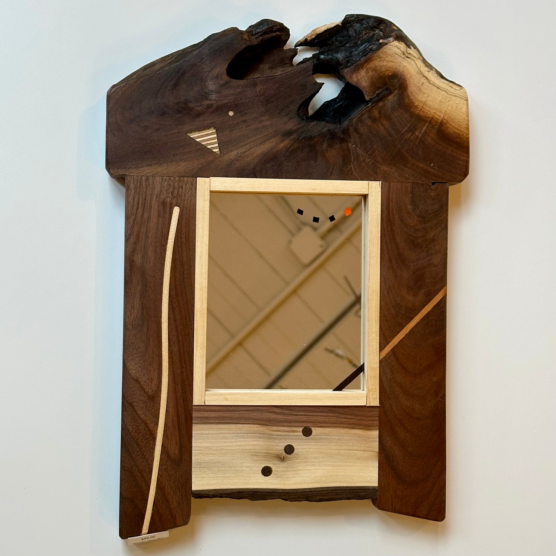 This handmade mirror was created in Pittsburgh, PA with wood from naturally  fallen trees and recycled mirror. The inlay details, raw edge and mirror detail make this a truly one of a kind, functional piece of  art.