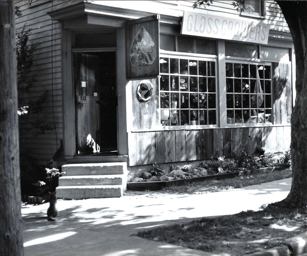 To the left: The original location of Glass Growers Gallery on the corner of W. 2nd St. and Plum St. in downtown Erie, PA and the original sign/logo.