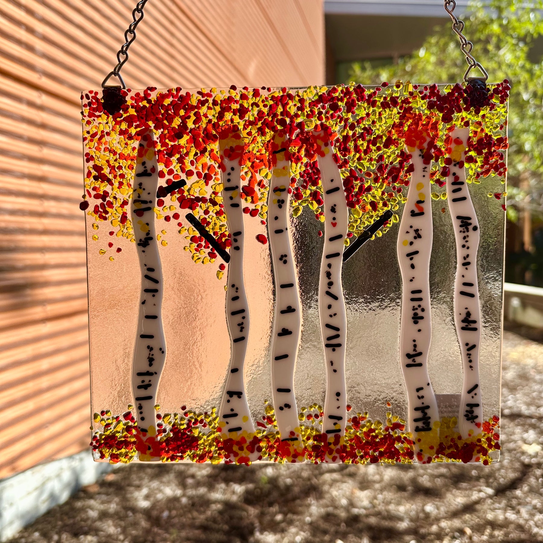 A glass panel with 6 Birch Trees covered in red, orange, and yellow leaves is handmade from fused glass.